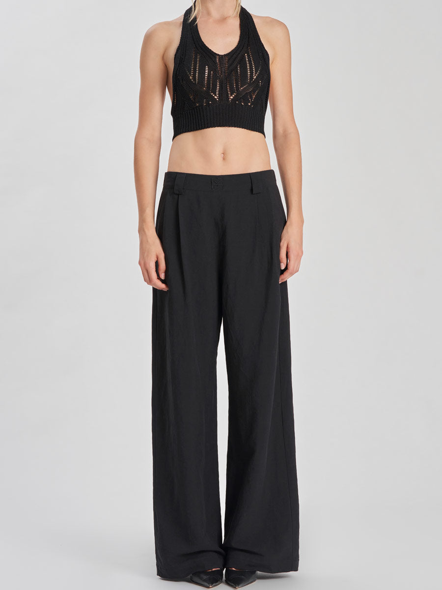 Stunning wide leg black linen trousers you can wear with flair! These pants feature a flat front, with gathered seams, together with an elasticated back, to pull on easily. Boasts details such as added belt loops, with an extended stitched loop decoration; plus 2 side seam pockets for added swagging rights!