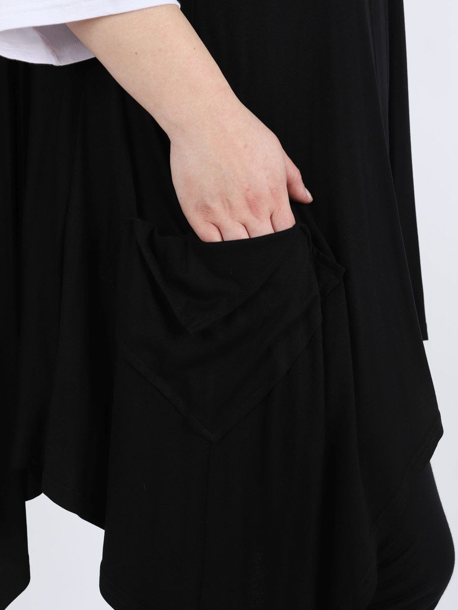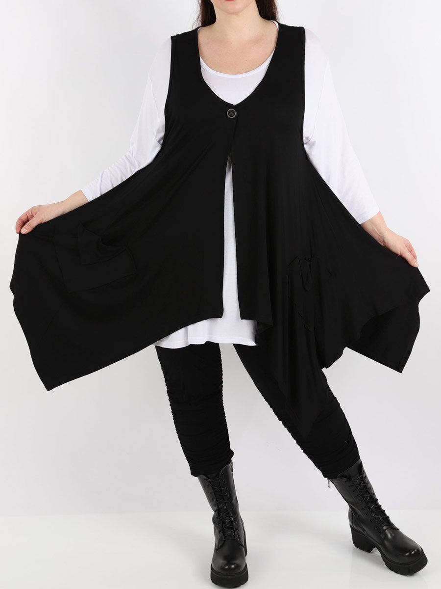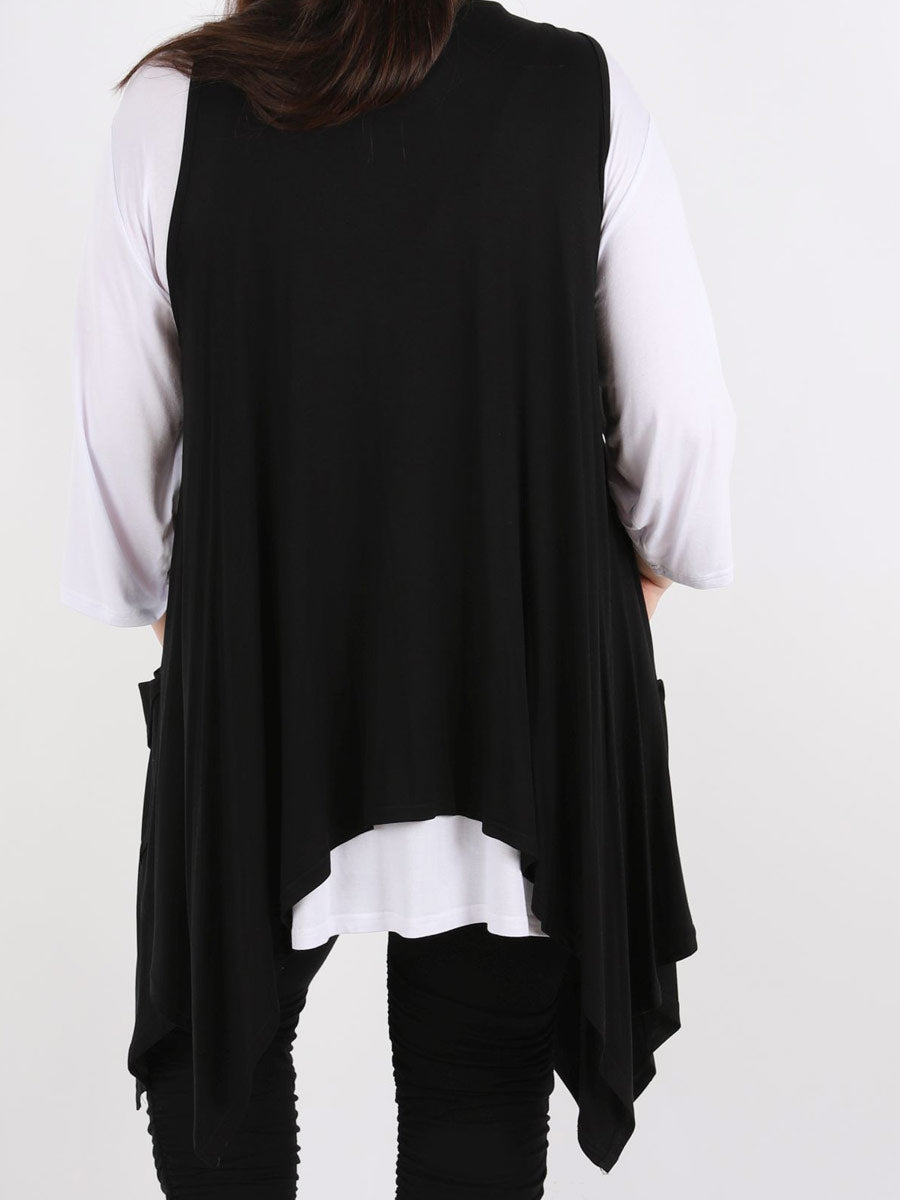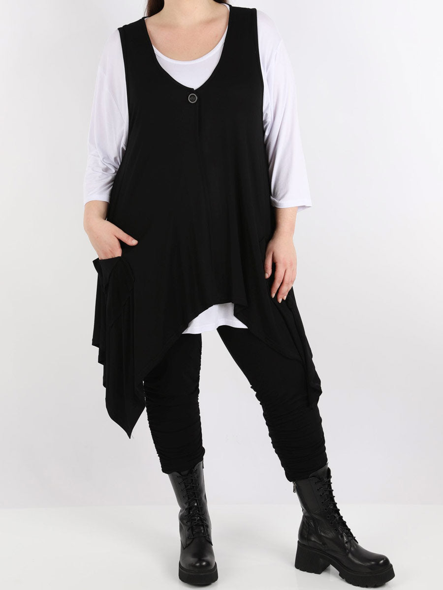 Long jersy waistcoat with one button fastening.   Low V neck,sleeveless style with dropped hemline front and back.  Wear over shirts or jersey tops teamed with harem pants.