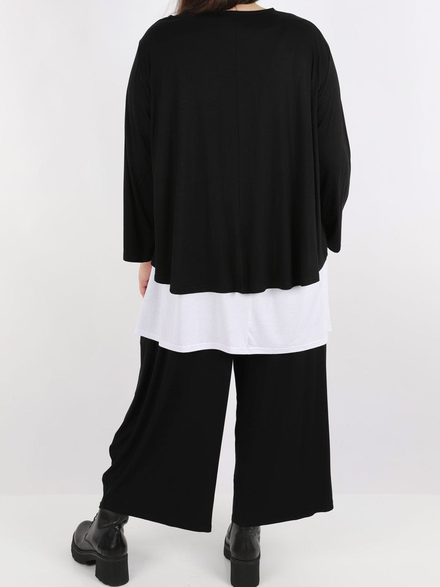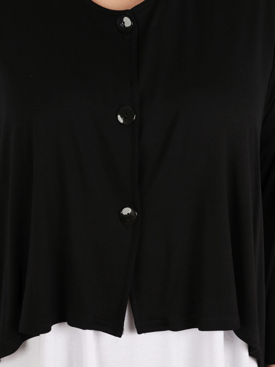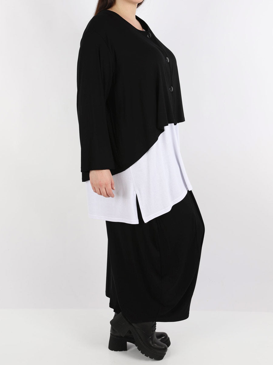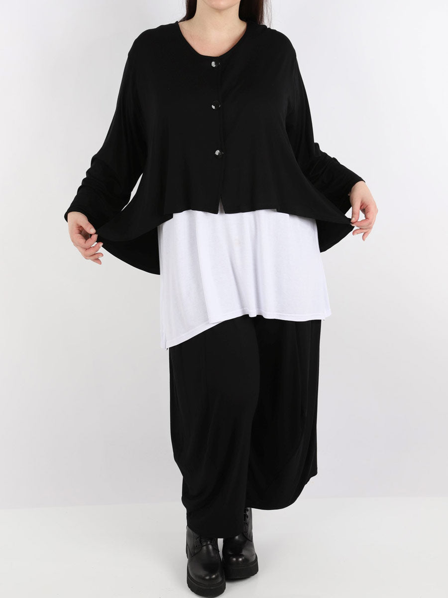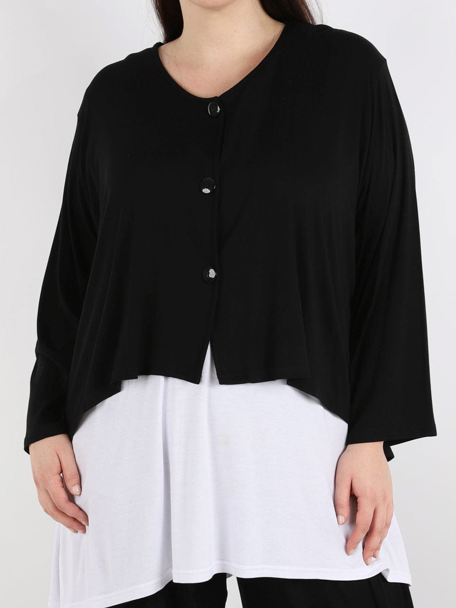 Jeresy long sleeved short cut wide  jacket.   Round neck, 3 button fastening,long quite wide sleeves.   Longer length back of garment - great for layering or teaming with jersey pant.