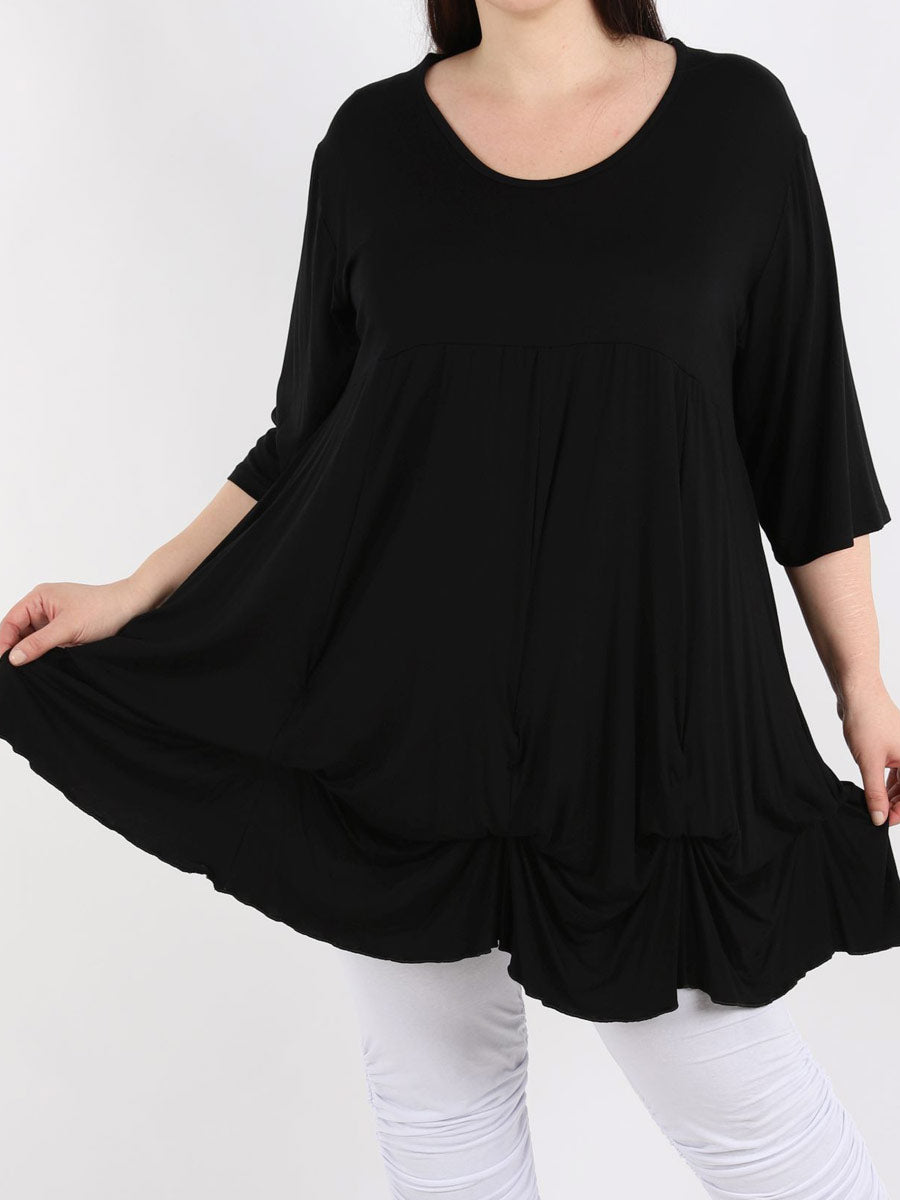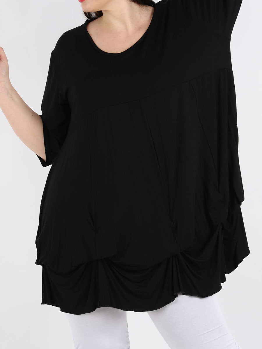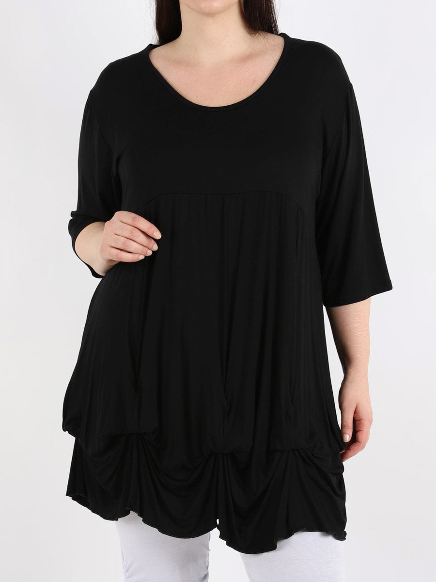 Round neck 3/4 sleeve jersey tunic top.   Small tucks at either side creating a ballon type fitting shape.   Below hip line length.  Oversized body, 3/4 sleeves