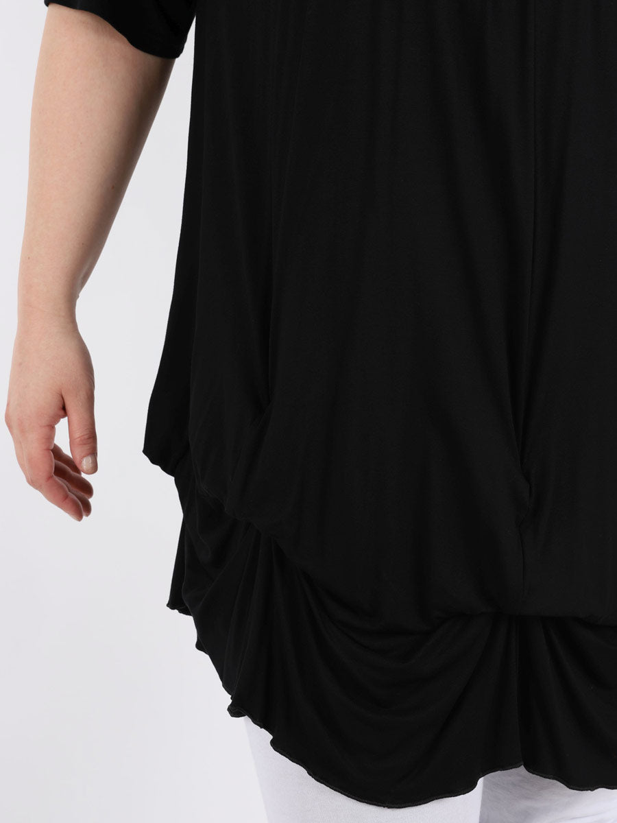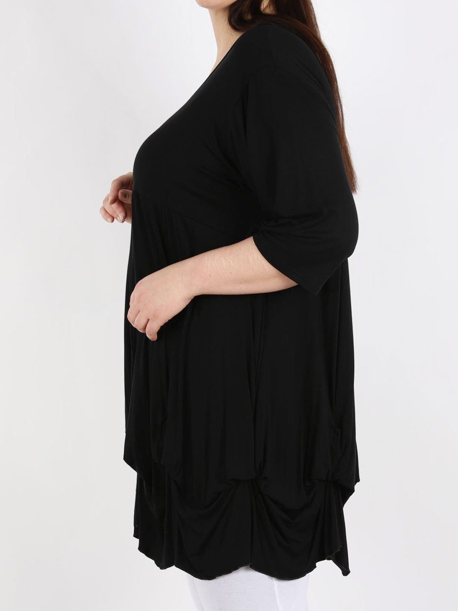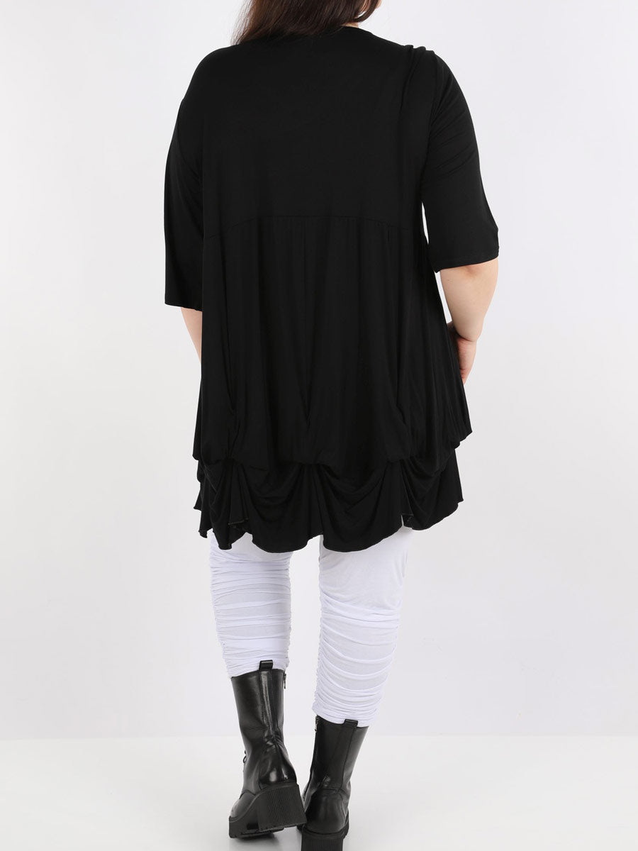 Round neck 3/4 sleeve jersey tunic top.   Small tucks at either side creating a ballon type fitting shape.   Below hip line length.  Oversized body, 3/4 sleeves