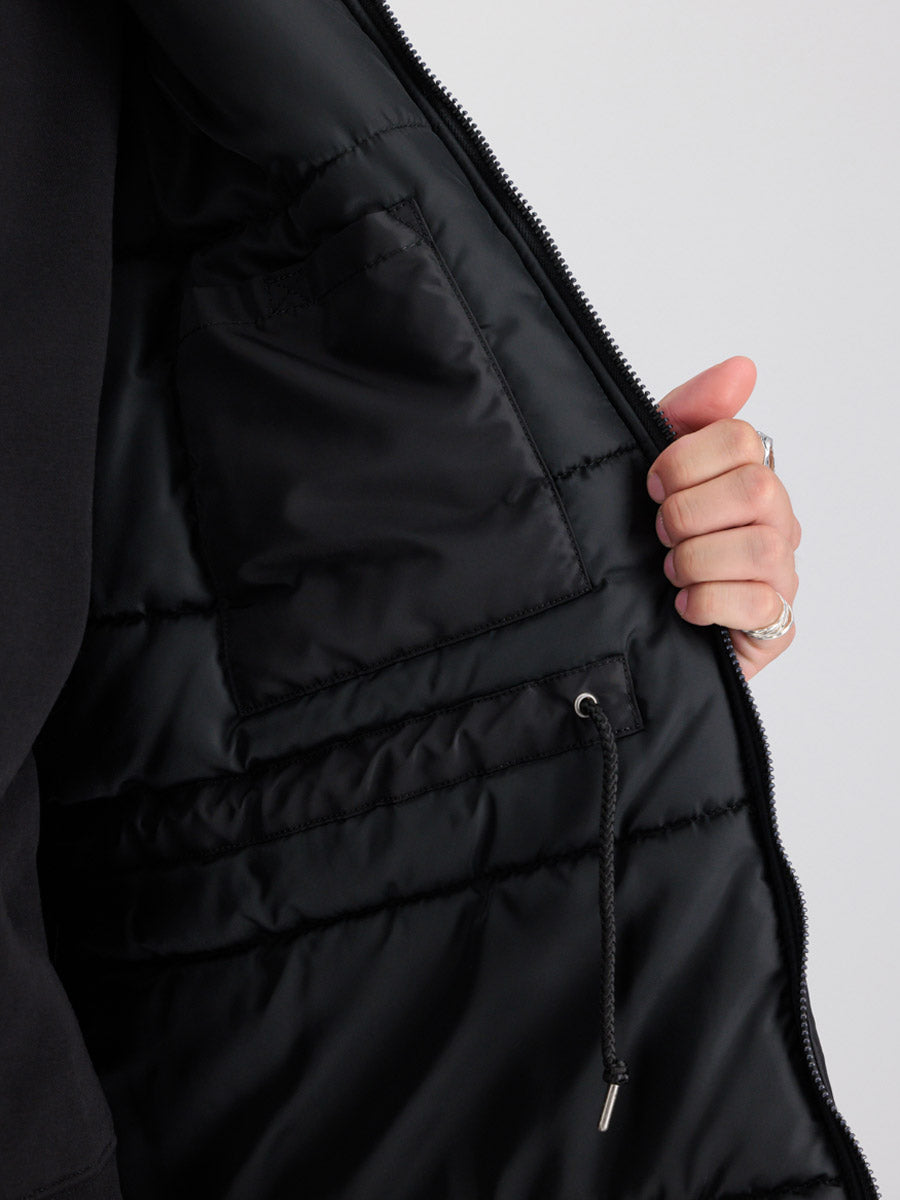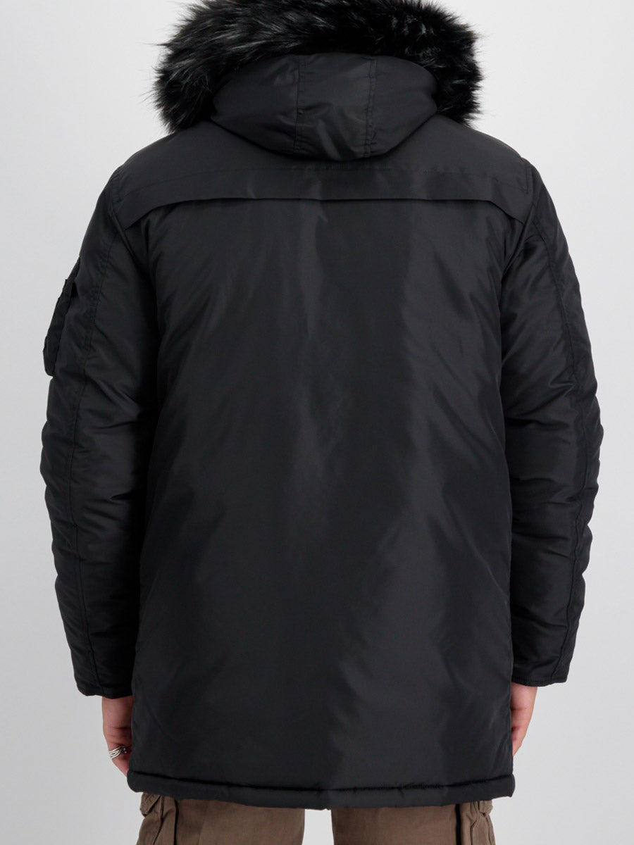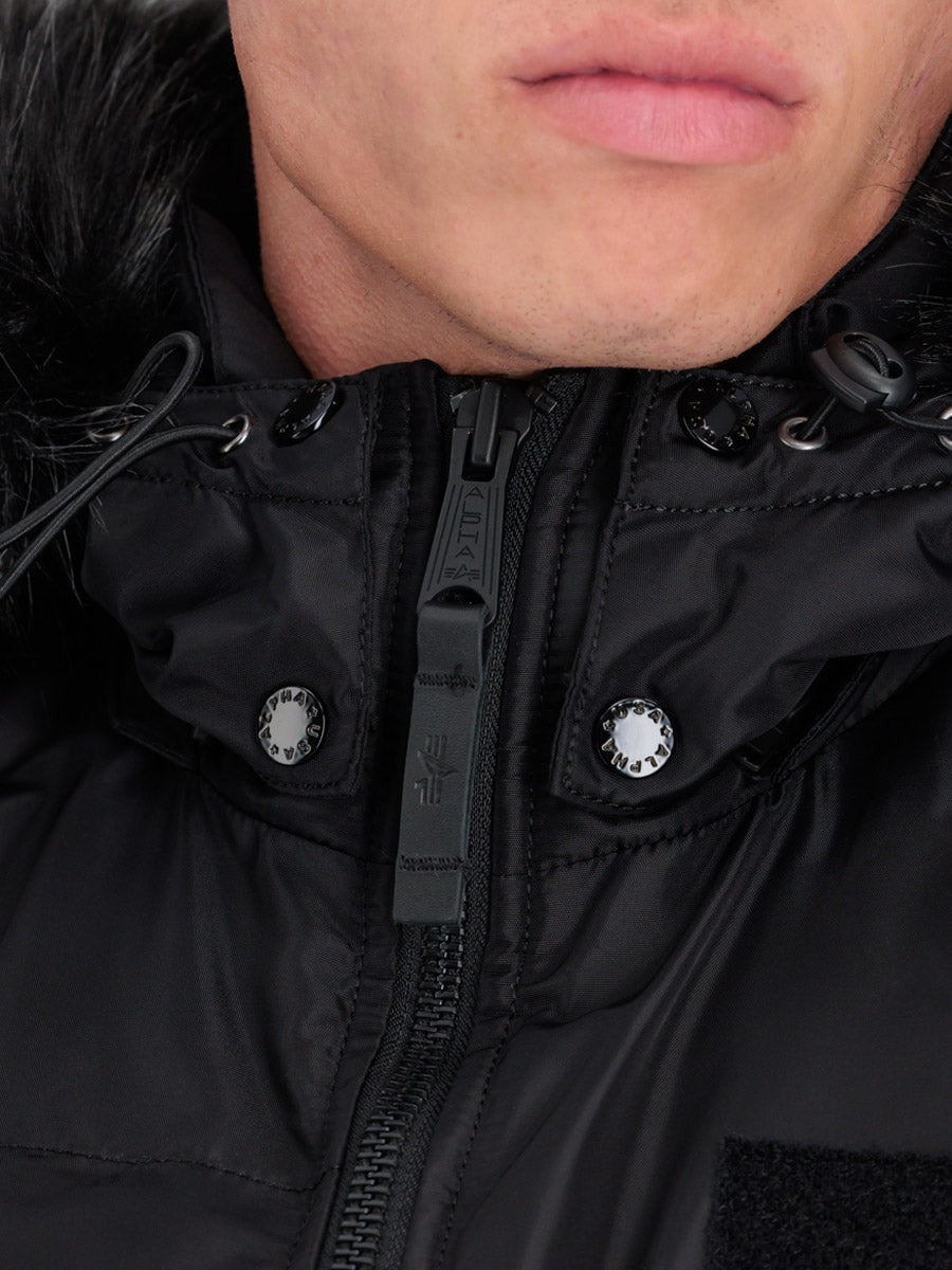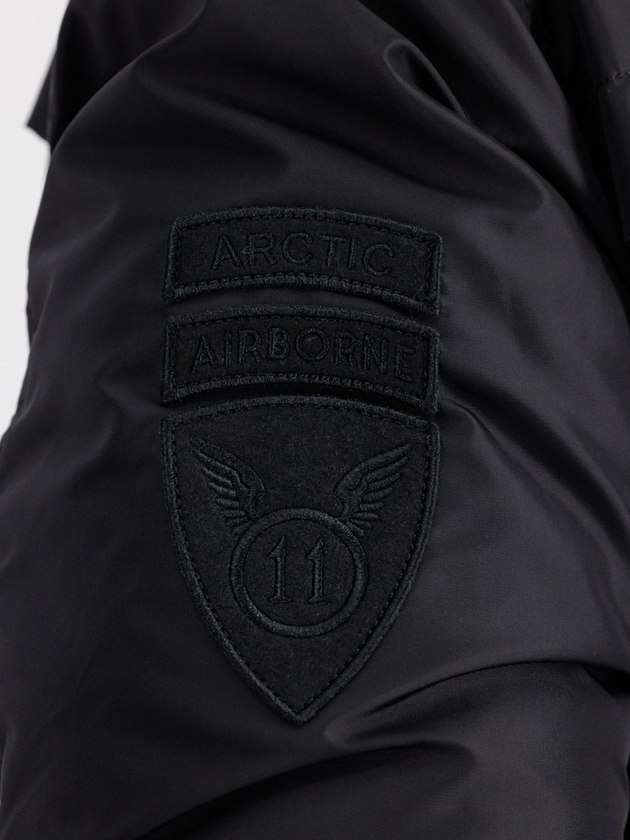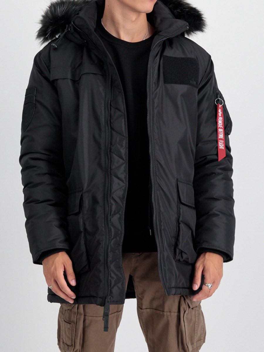Arctic airbourne jacket with hood  - detatchable Faux fur trim around hood edge.  Concealed flap zipped pocket , 2 patcch pockets with velco flaps and 2 way zip fastening - Patch utility pocket on sleeve with zipper and REMOVE BEFORE FLIGHT pull ( which can be removed and used as a key ring).  2 covert pockets with velcro closure.  Inside quilted lining with pull cord and toggle on inside waist for tighter fit.