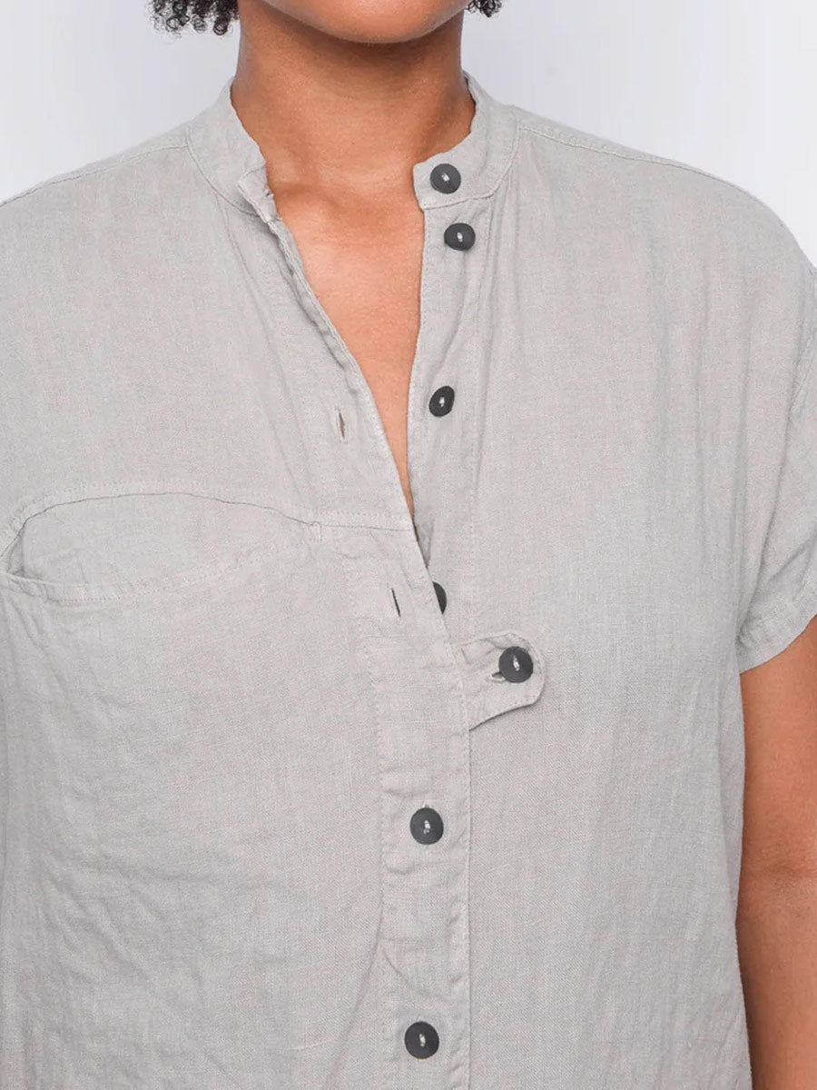 Effortlessly cool, this pebble linen jumpsuit features a mandarin collar and short cap sleeves. The button-through front and 'tab' detail add unique flair, while those 5 insert pockets -1 on front; 2 on hips and 2 on  legs are fab and convenient! Stay chill and stylish in this versatile jumpsuit.