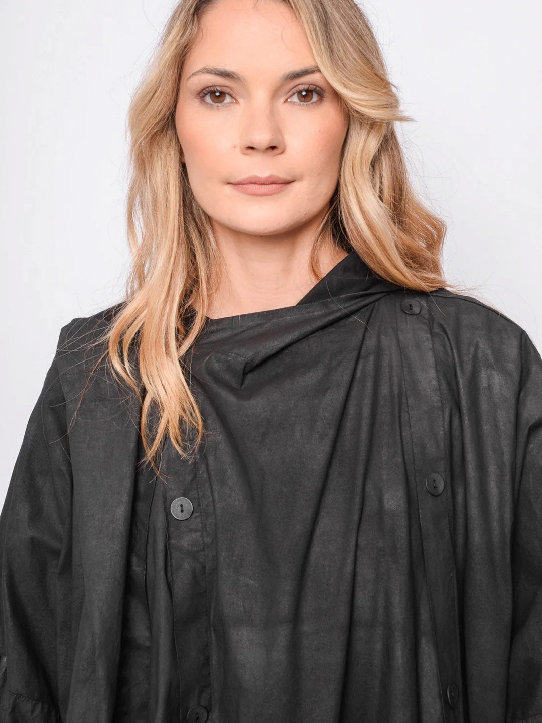 Unleash an edgy vibe with our fabulous oversize jacket/coat. Made with coated wax effect cotton, this hooded layer overlayer features a front tunnel pocket and two side pockets. The asymmetrical double breasted closing adds a unique touch while the surprise kangaroo pocket adds another!