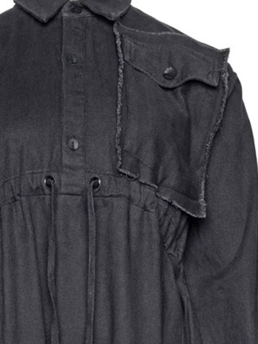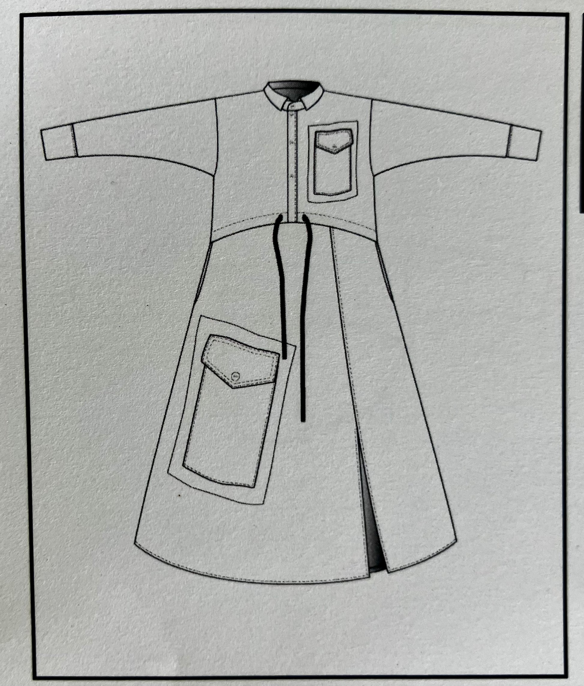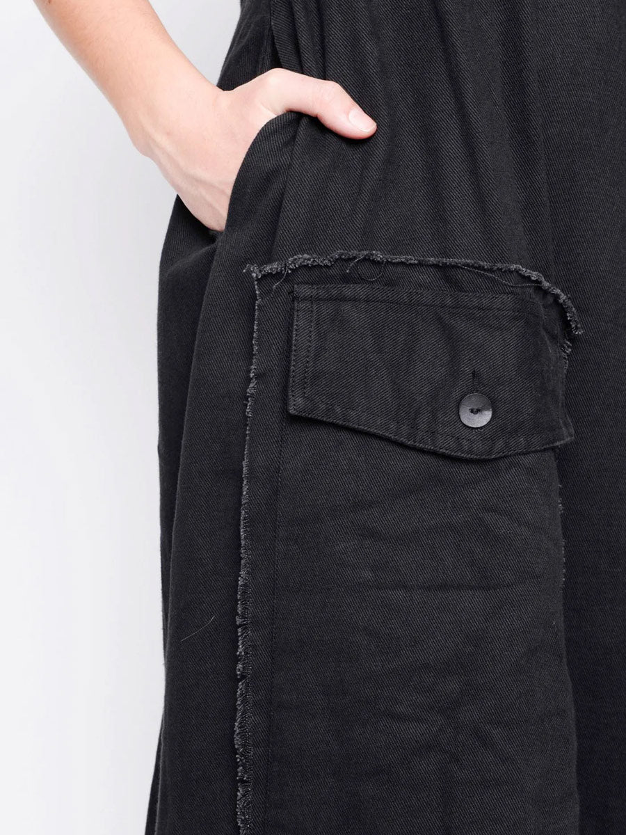 • Large flap pocket with button, on dress front x 2, with raw edge detail surrounding. Also 1 x flap pocket on back
