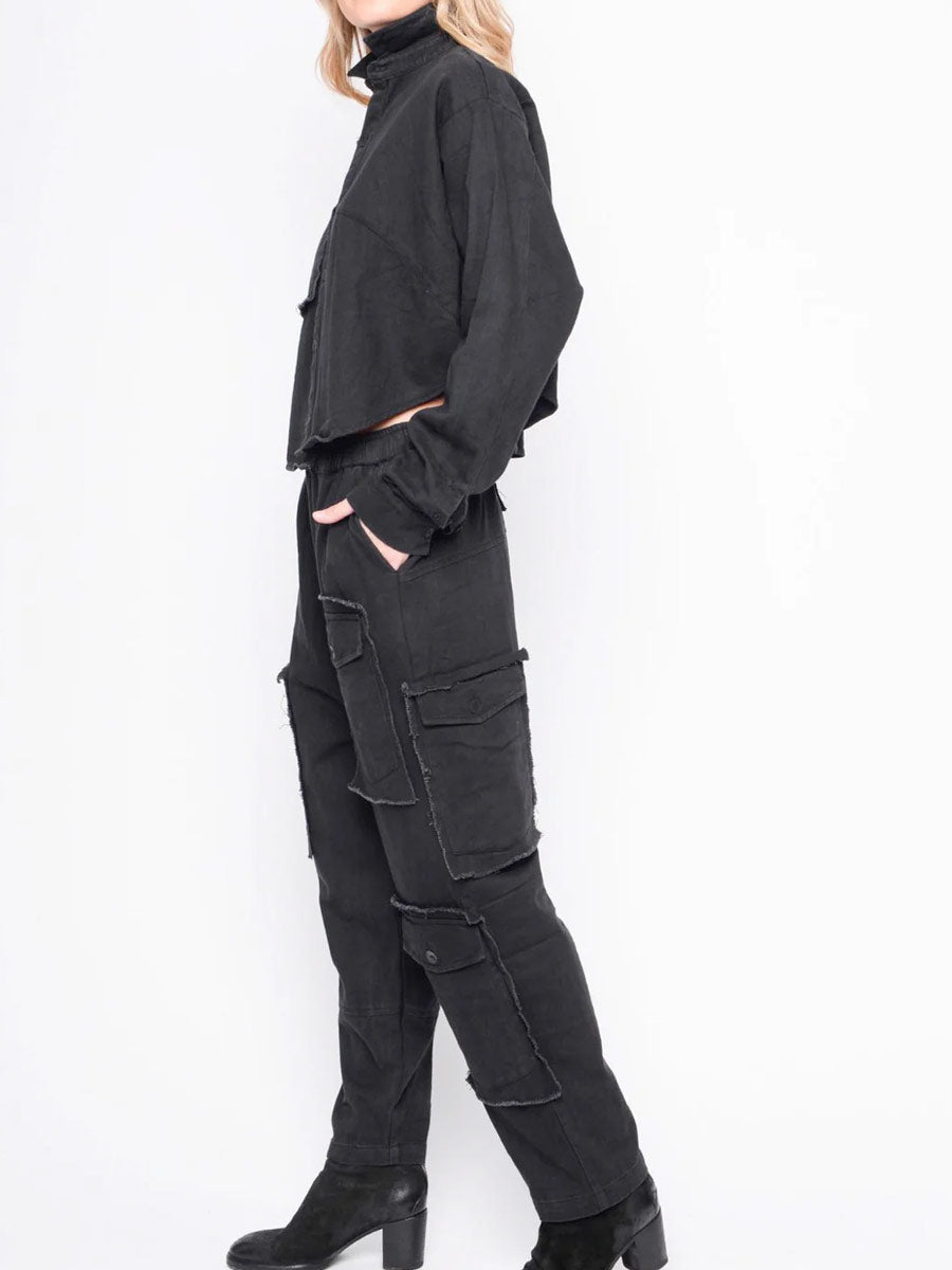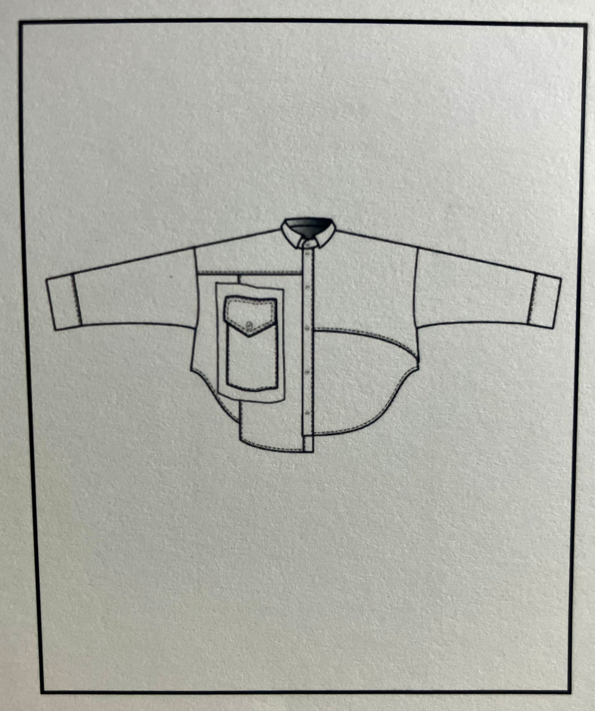 • Large patch pocket on front detail, with raw edge seam finish around pocket
