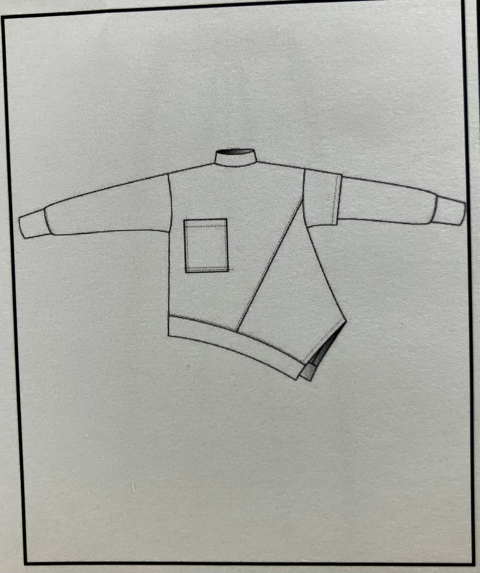 • Crew neck with wide seamto drop shoulders with 'cap' overlap feature on one shoulder.