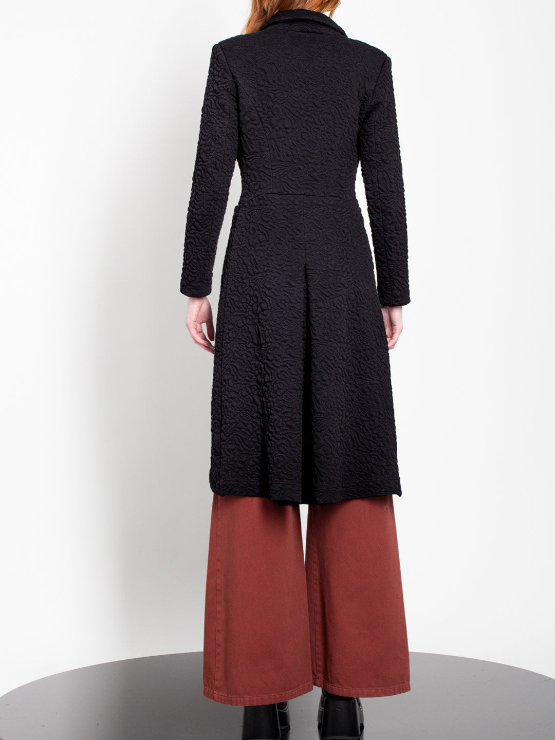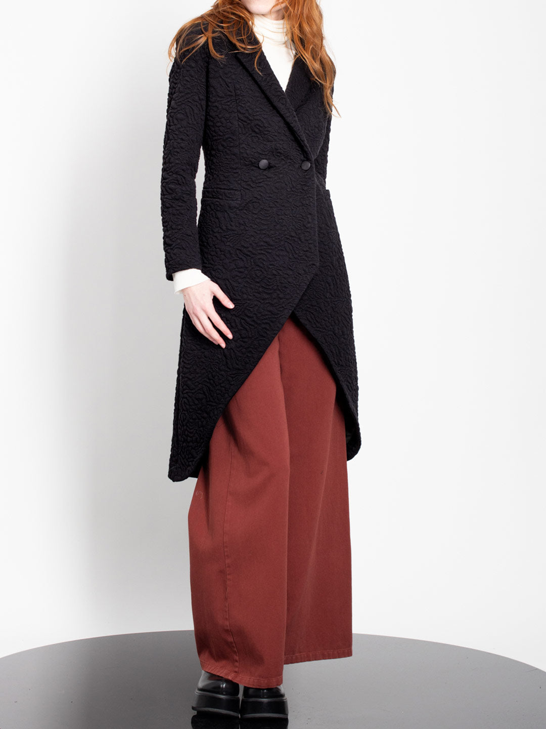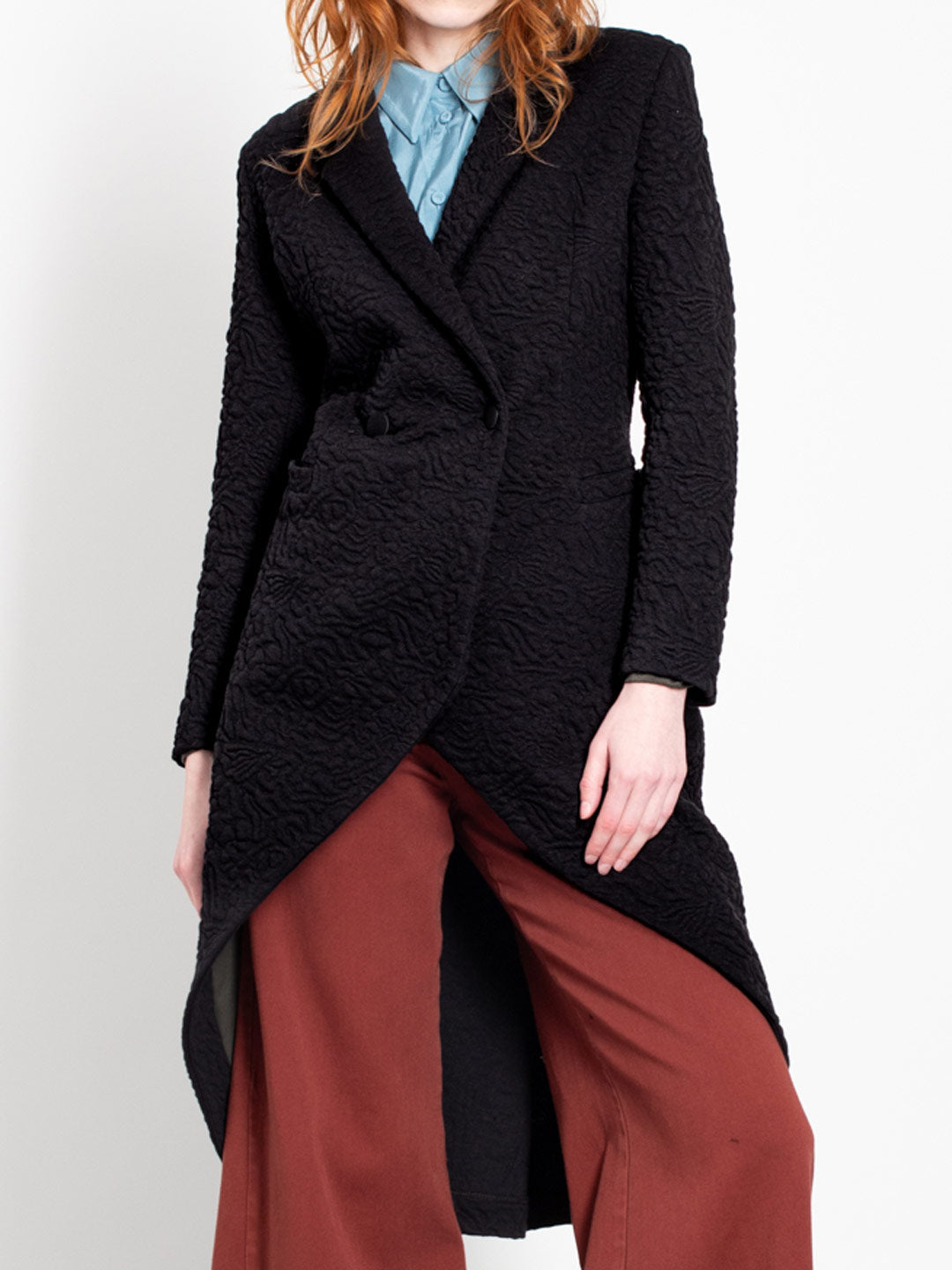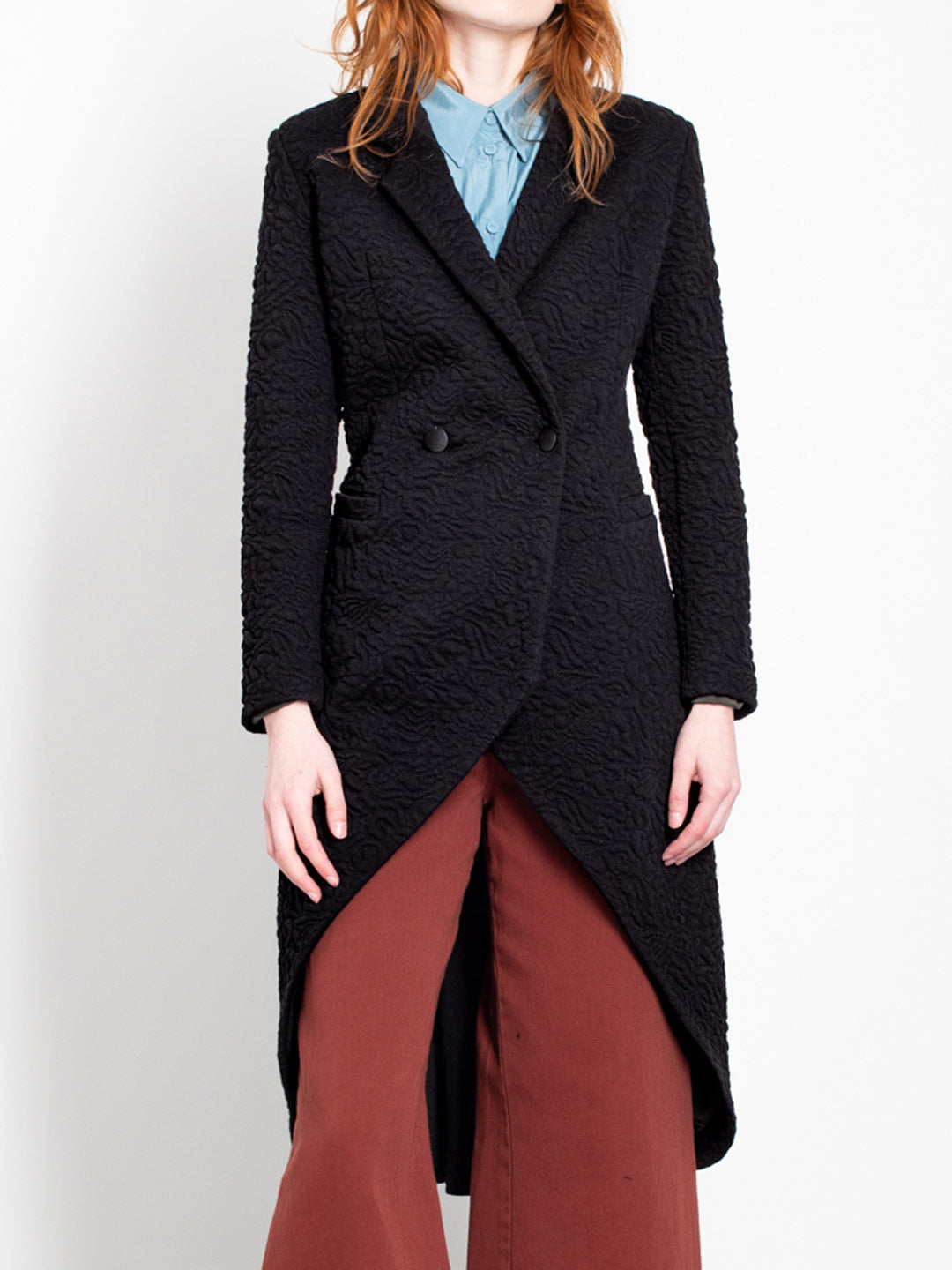 Indulge in luxury with the Gaffer&Fluf "Ct93081" Coat. This cool riding coat features a soft cotton jacquard and a sweeping hemline to a long back, perfect for making a statement. The double breasted design is fitted and semi-lined, with convenient slash pockets. Elevate your wardrobe with this elegant and sophisticated coat.