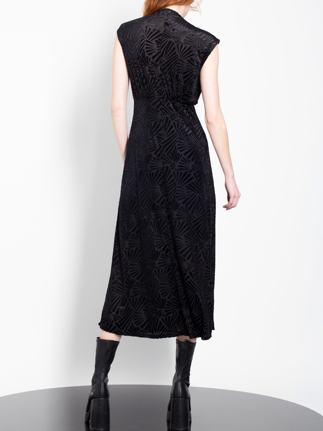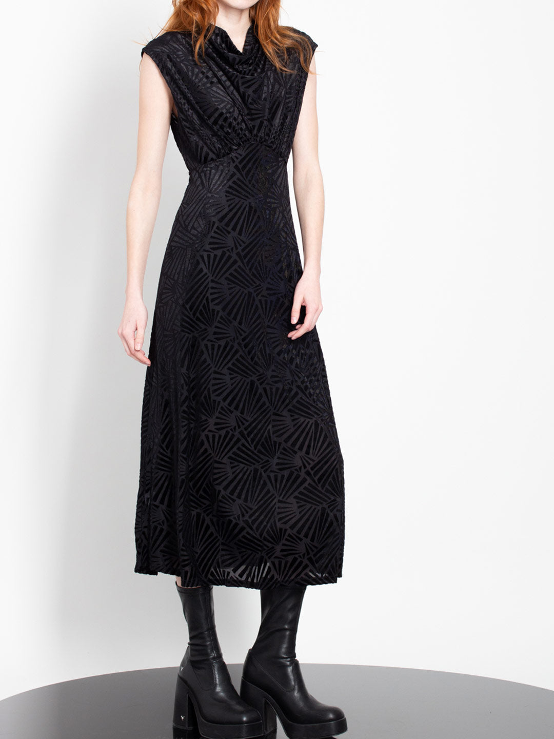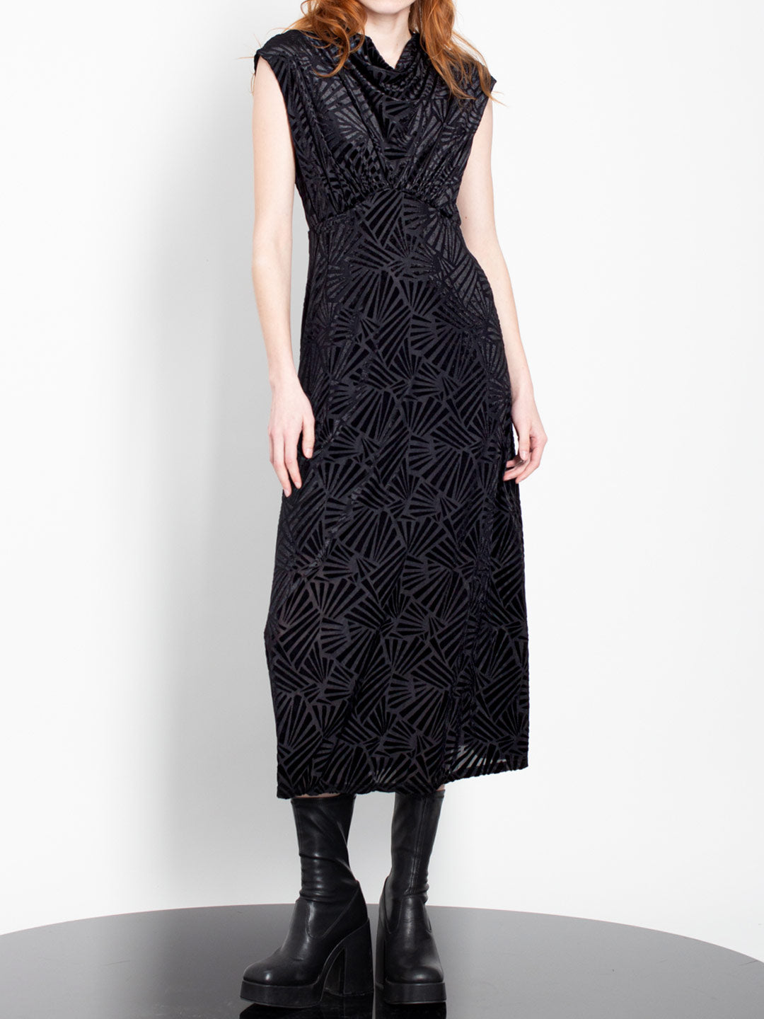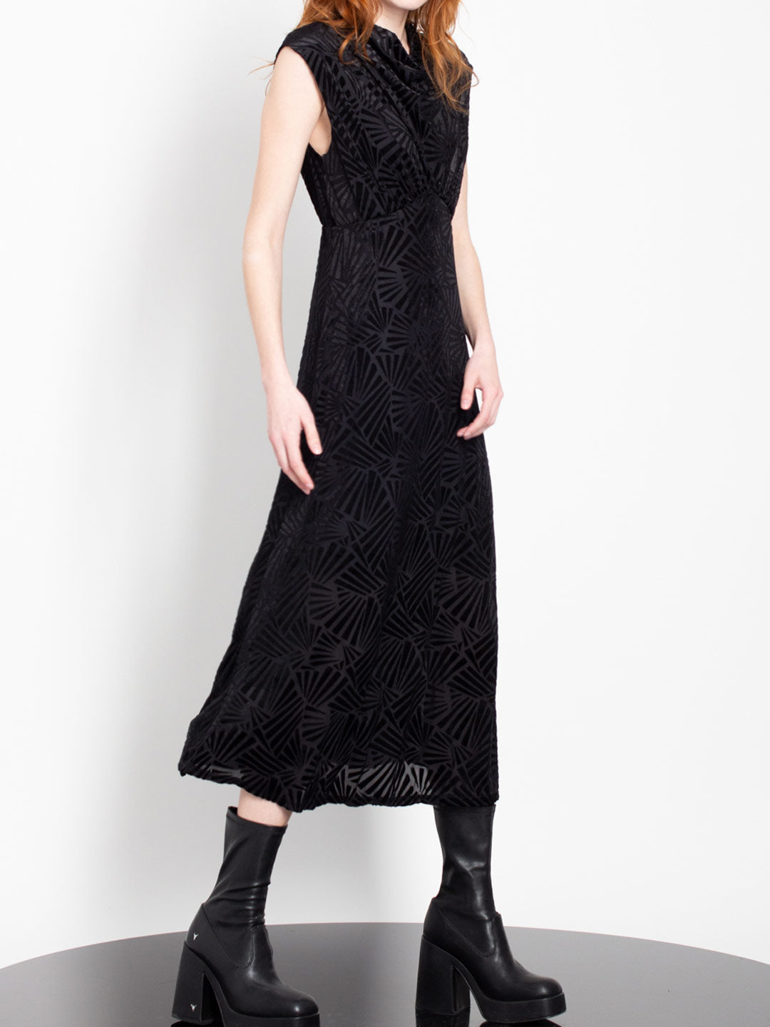 Indulge in elegance with our "Dr96000" dress from Gaffer&Fluf.  This devore sleeveless maxi gown boasts a soft cowl neckline and a curved effect that flatters the figure. The top tucks into the skirt, creating a stunning silhouette. Elevate your wardrobe with this beautiful and exclusive dress.