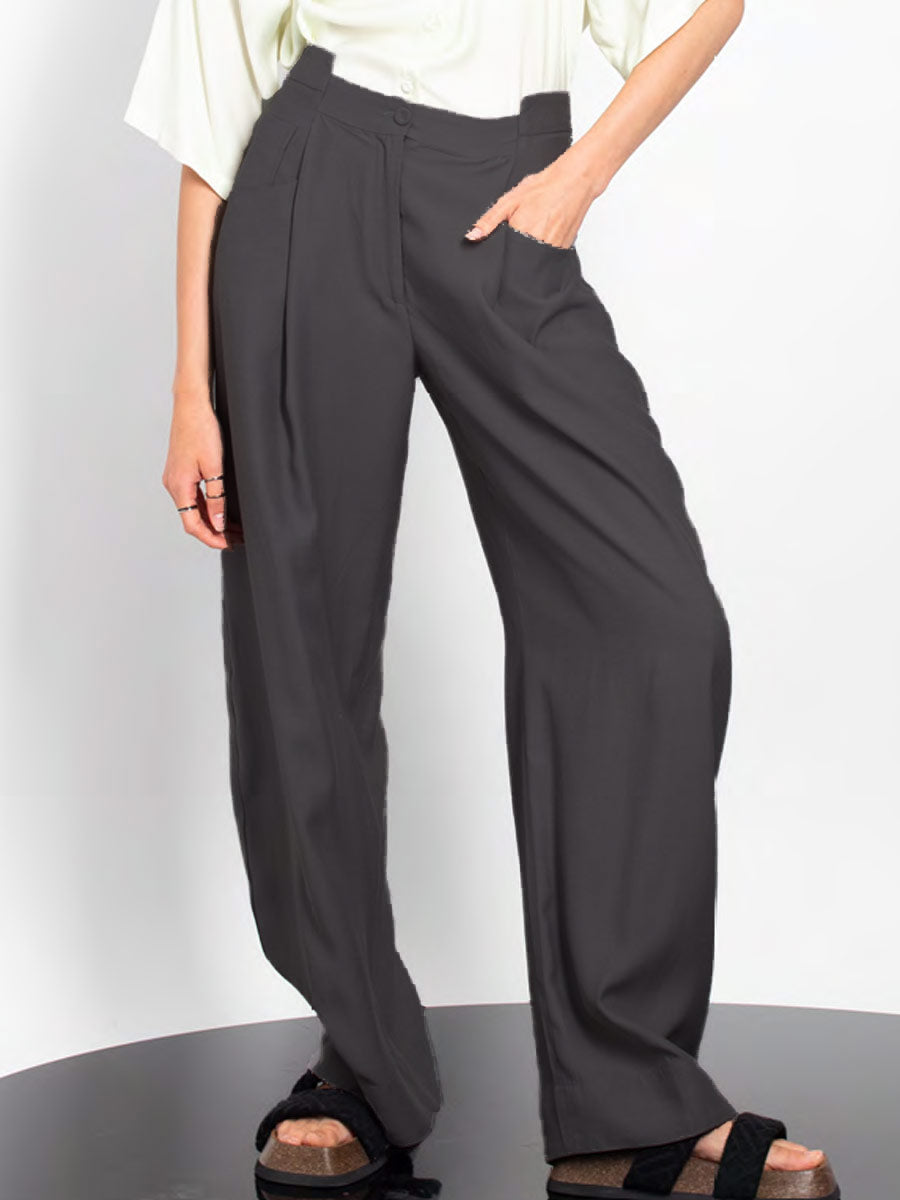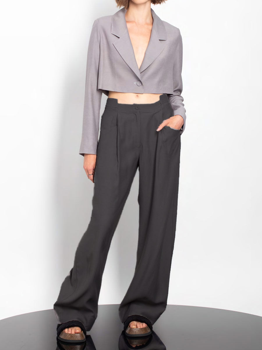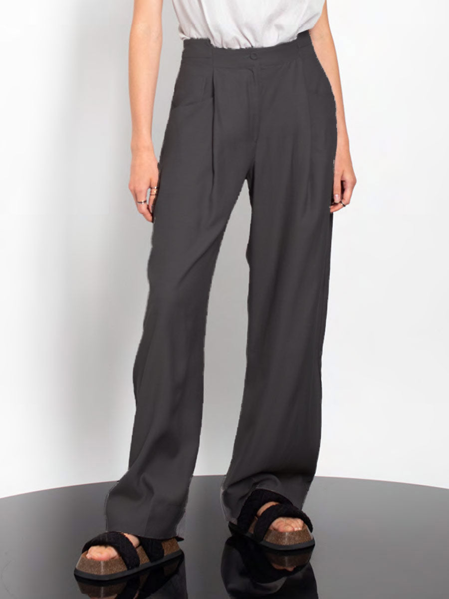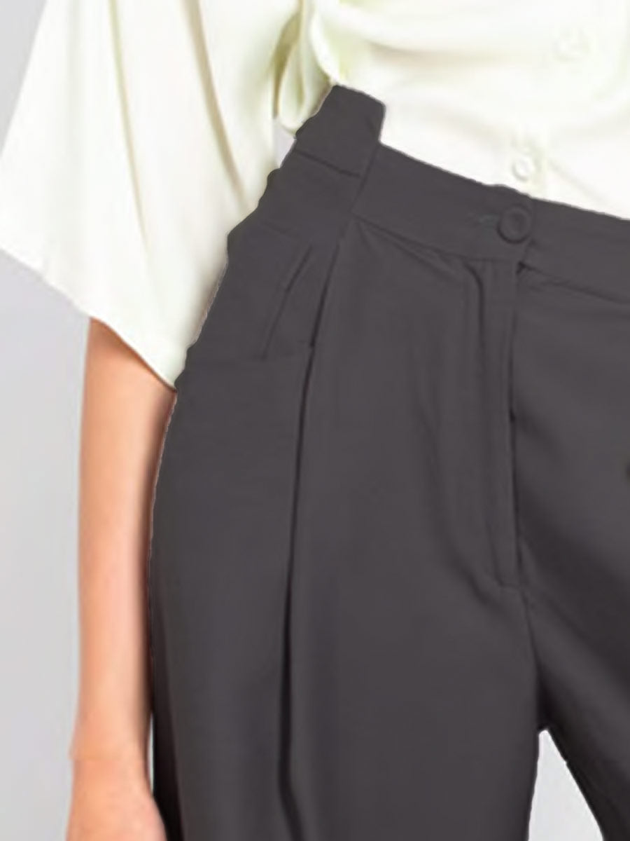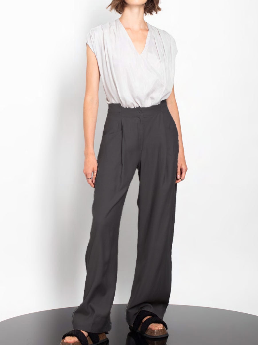 Wide legged easy fit pant in a drapable viscose mix.   Fixed waistband dropped at front for an asymetric look.   Centre zip fly with button fastening.    Pleating at front with large pockets either side - smaller pocket above on the right side. Panelling at back  waist and  side leg for a fabulous fit.  Inner taping in contrast lime.