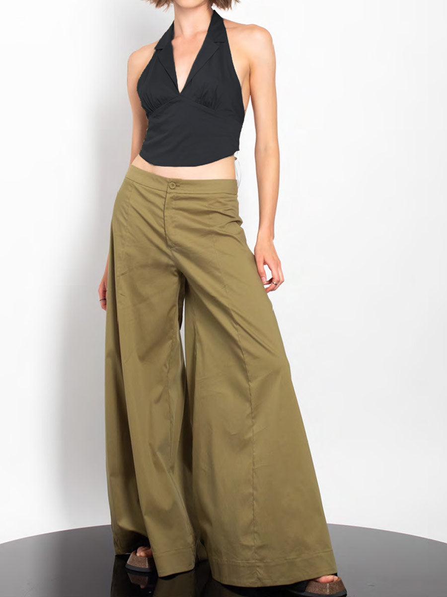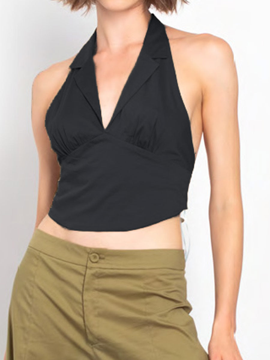 Cotton top with ties at neck and back - creating a halter type styling.   Jacket reveres on V neck - very waistcoat esk.    Rounded waist hem line.   Double fabric.