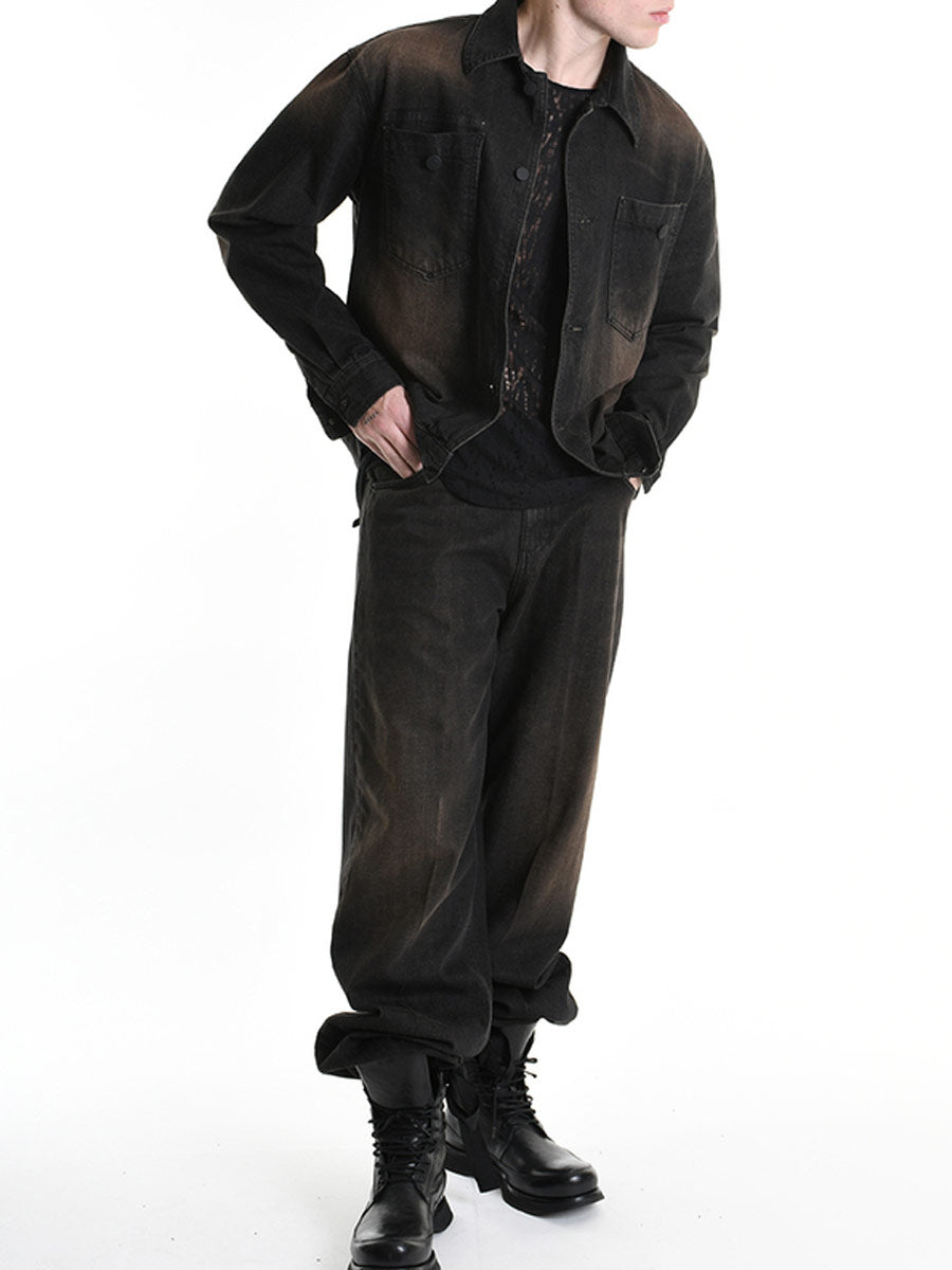 Relaxed fit, wide leg jean, in black with rust coloured distressing and stitching