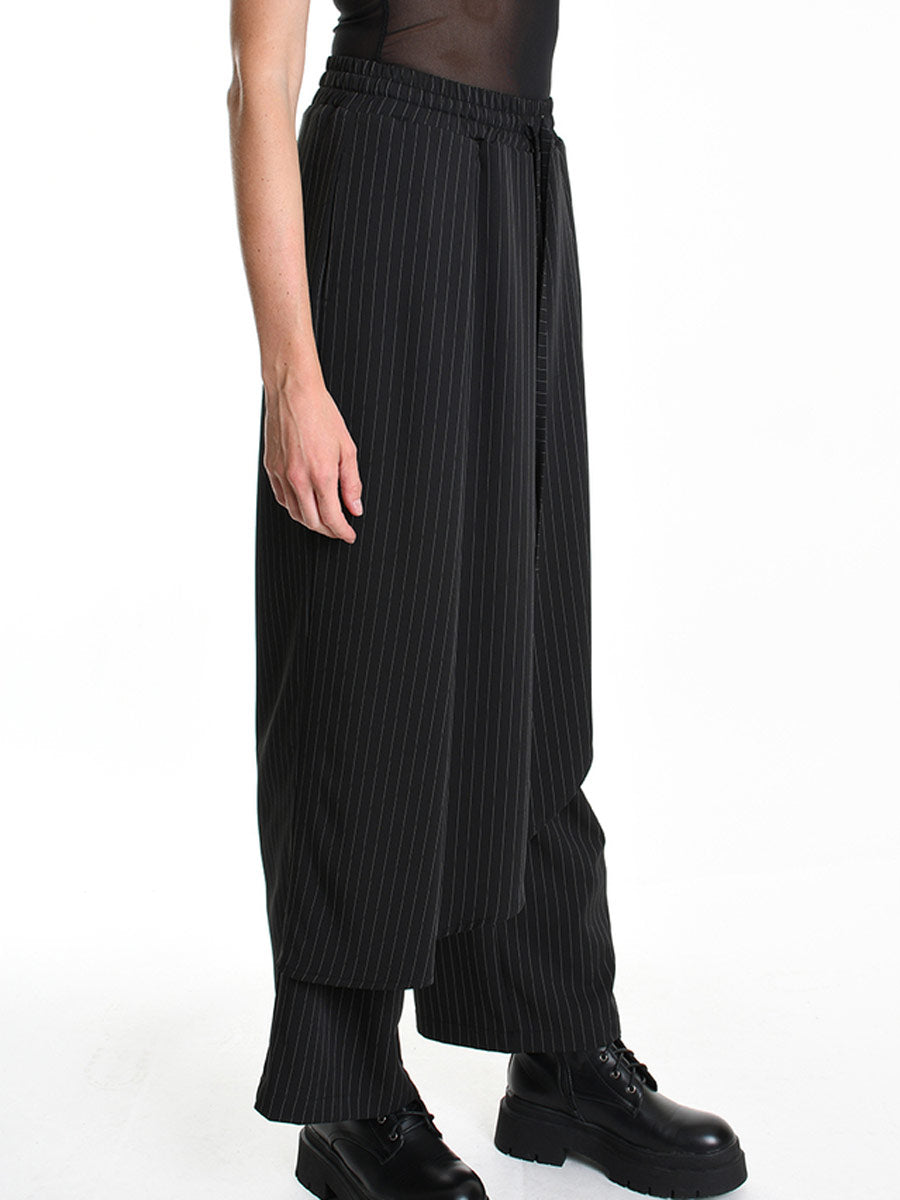 Wide leg, straight, pin striped pant, with stunning long asymmetric apron detail, falling to one side of the trouser in a flounce