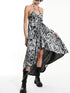 • Halterneck style dress, with a difference. Spaghetti self fabric ties from the V neck bodice, lace across the front, and then multi options lacing across the back, highlighting the fabulous deep V back.