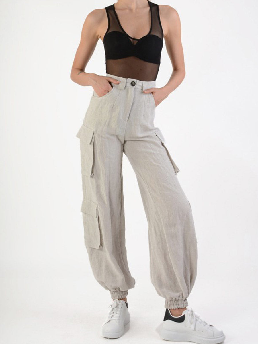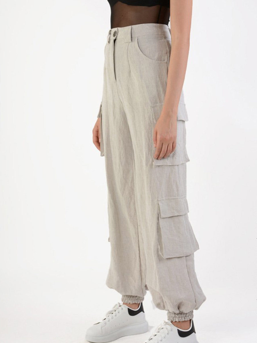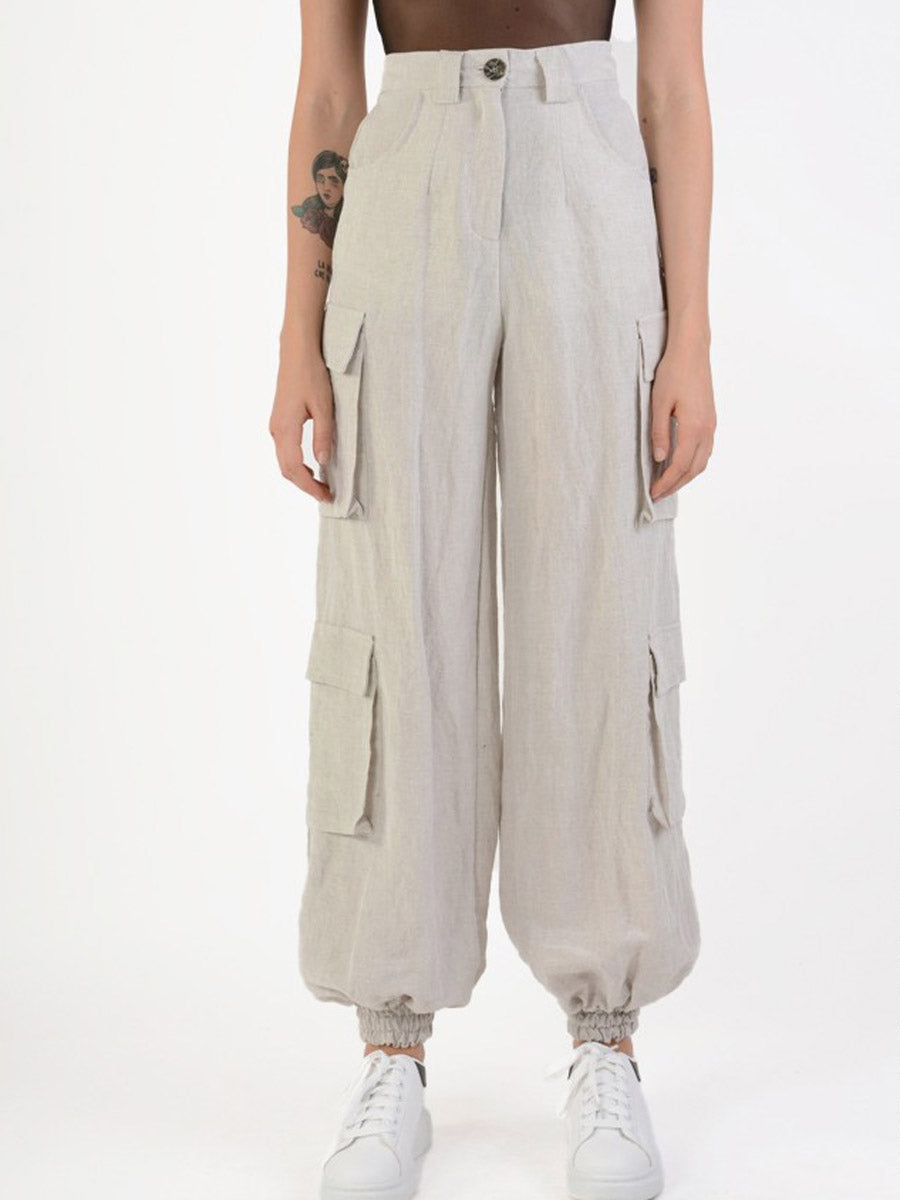 Linen  viscose wide cut cargo pant with side pocket detail.   Zip and button closure. side slant pockets - elastic cuffs.