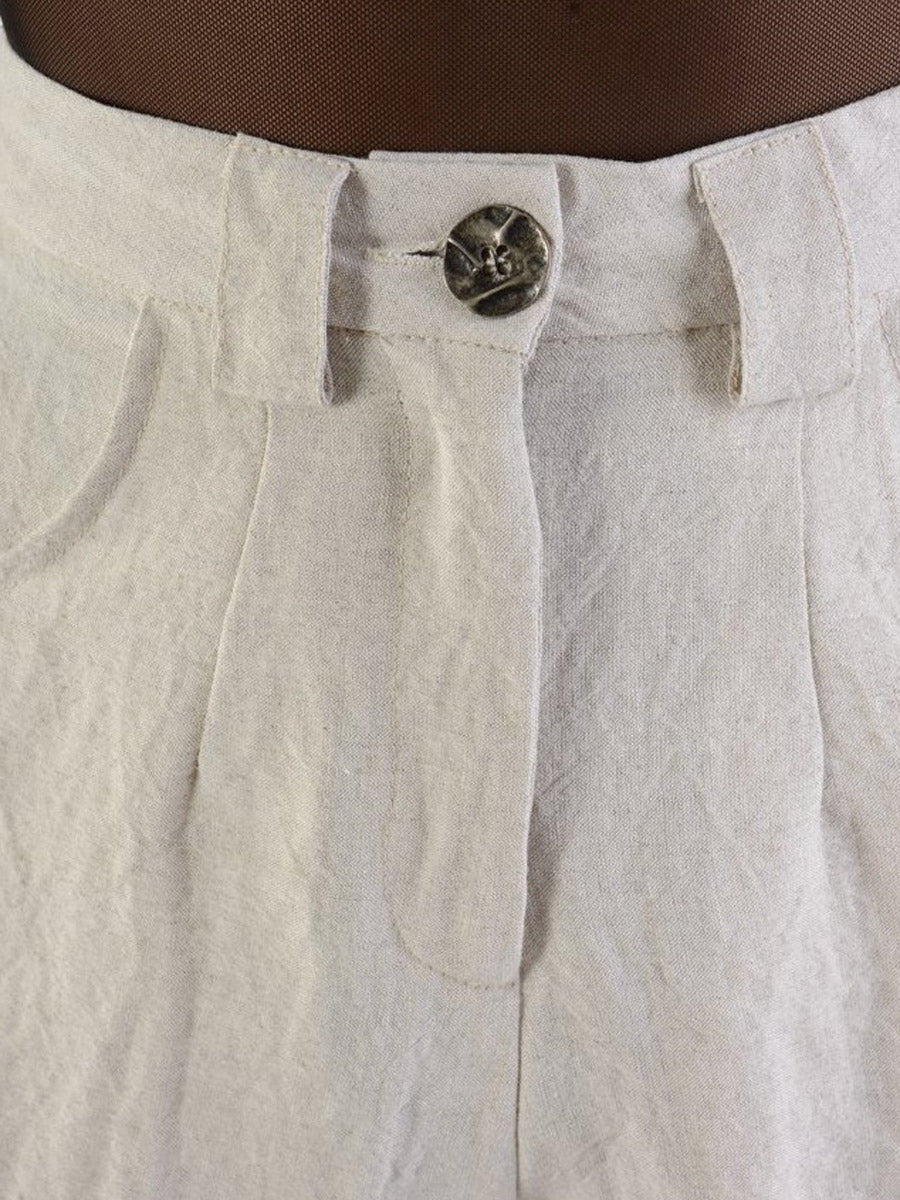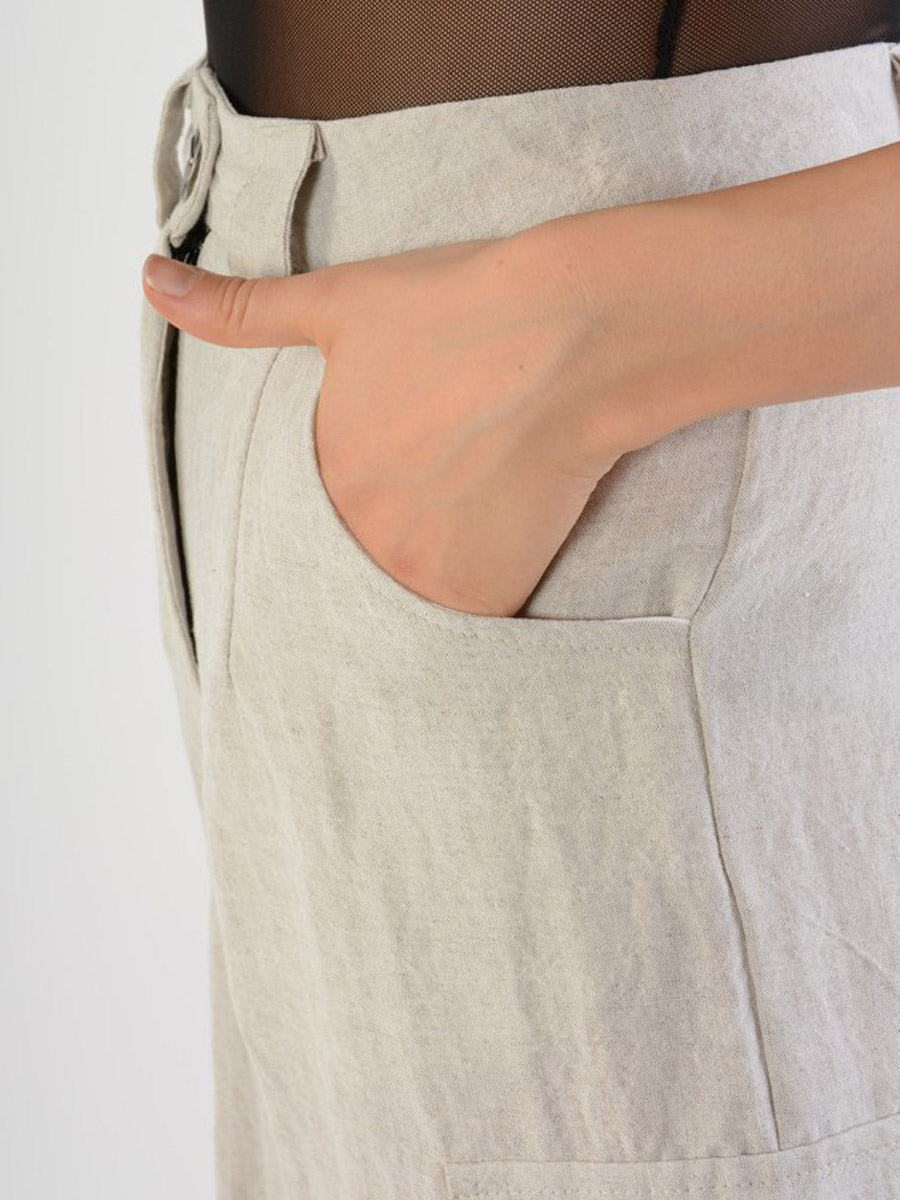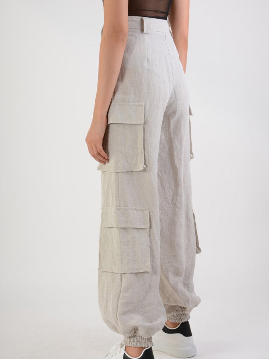 Linen  viscose wide cut cargo pant with side pocket detail.   Zip and button closure. side slant pockets - elastic cuffs.