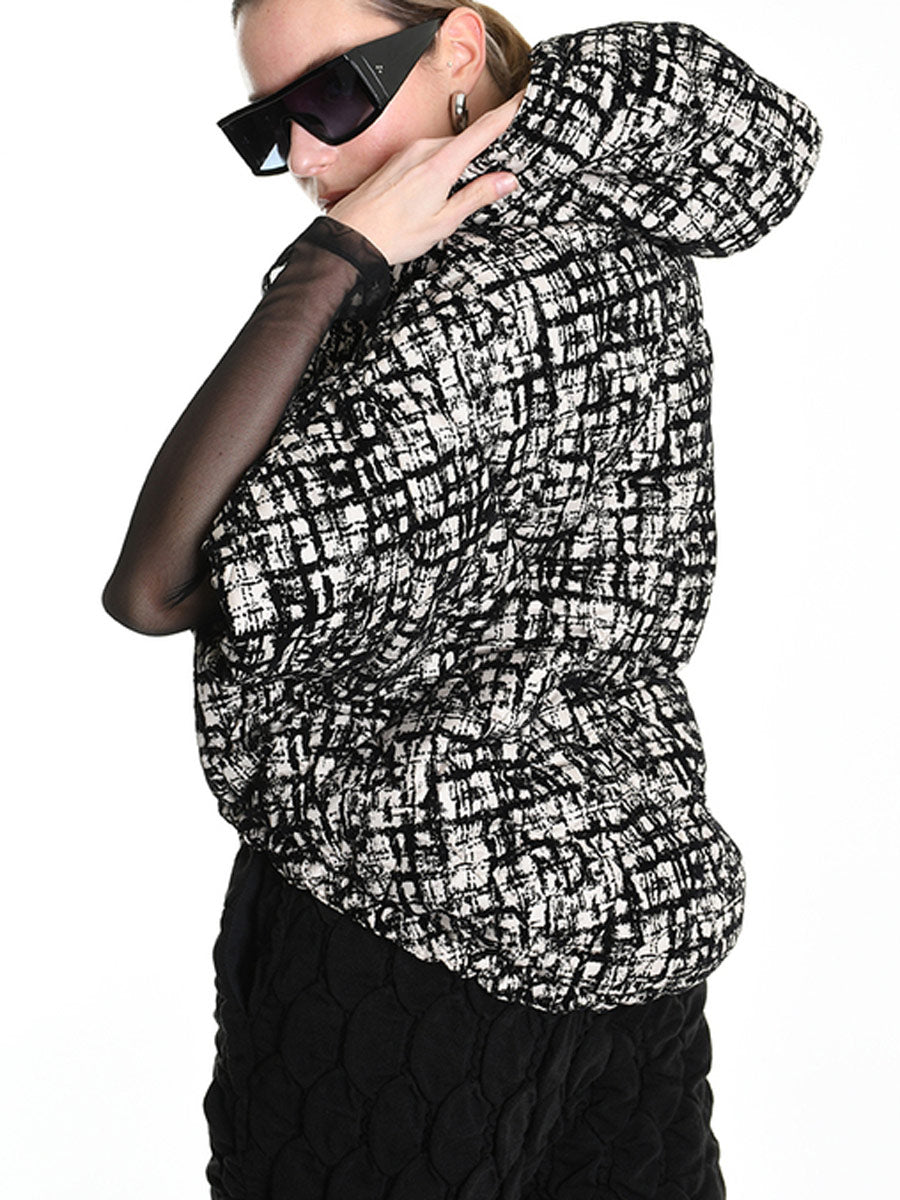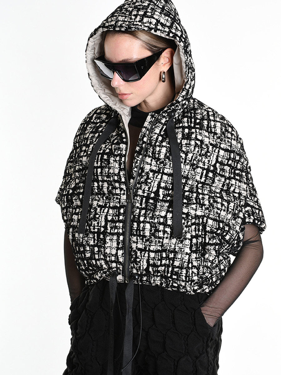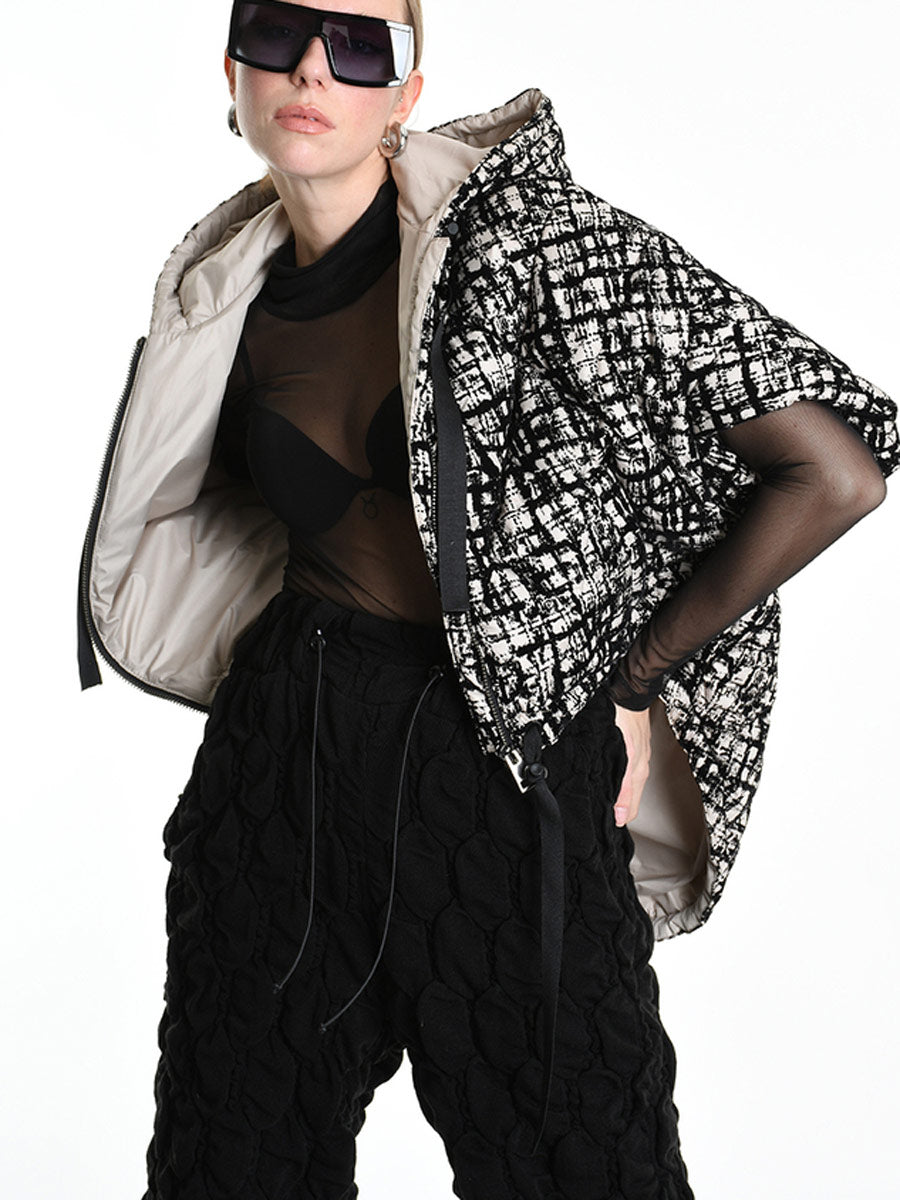 Bold black and cream patterned, quilted, cape jacket with hood