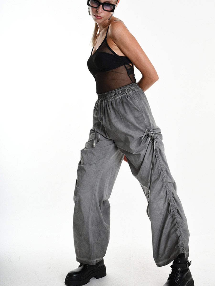 Distressed slate grey cotton, loose fitting, baggy, full length pants with drawstring side seams.