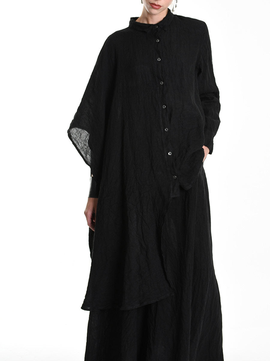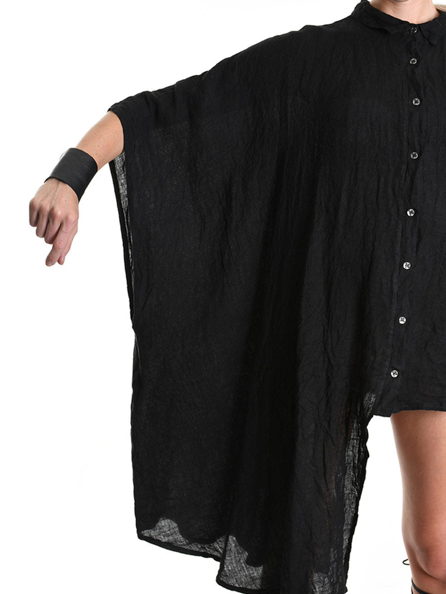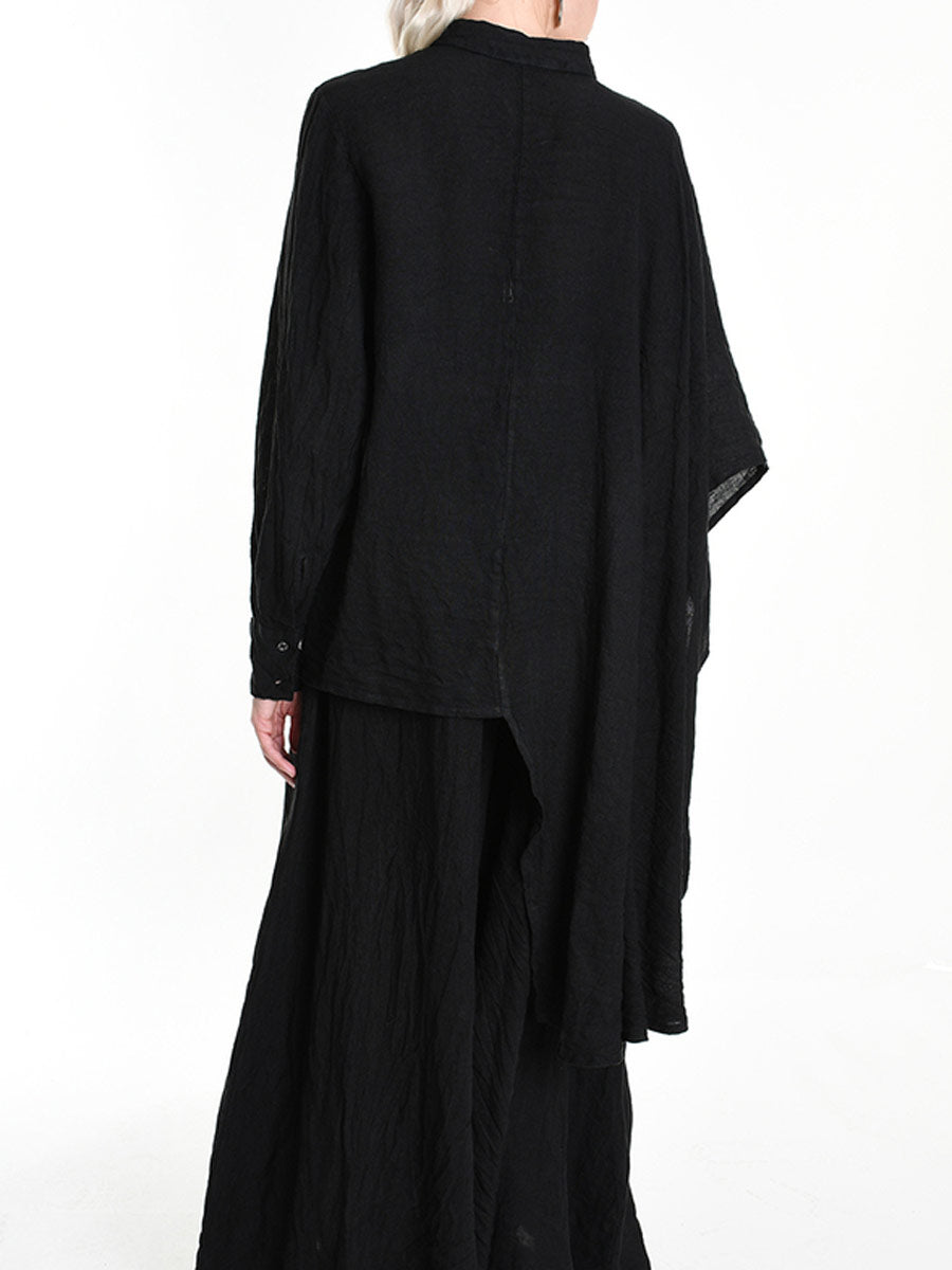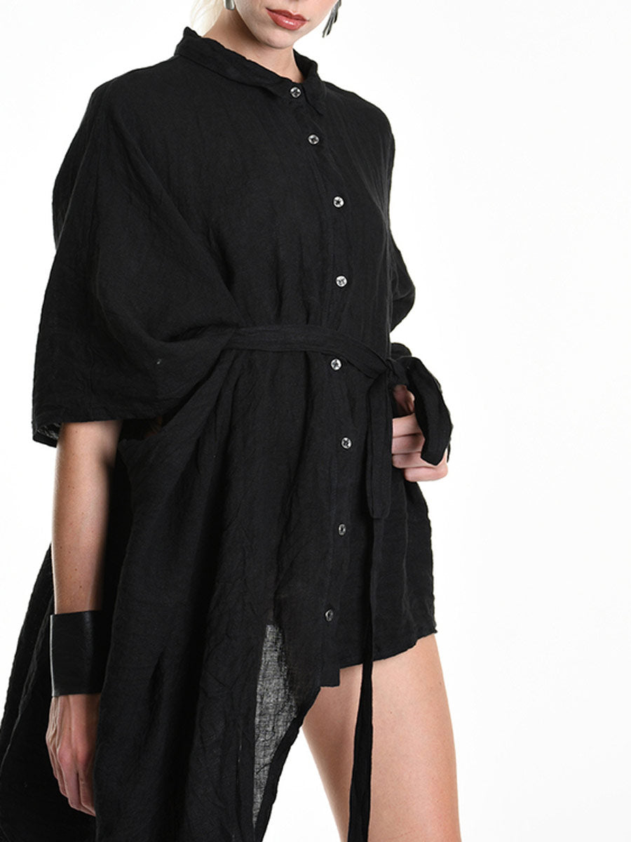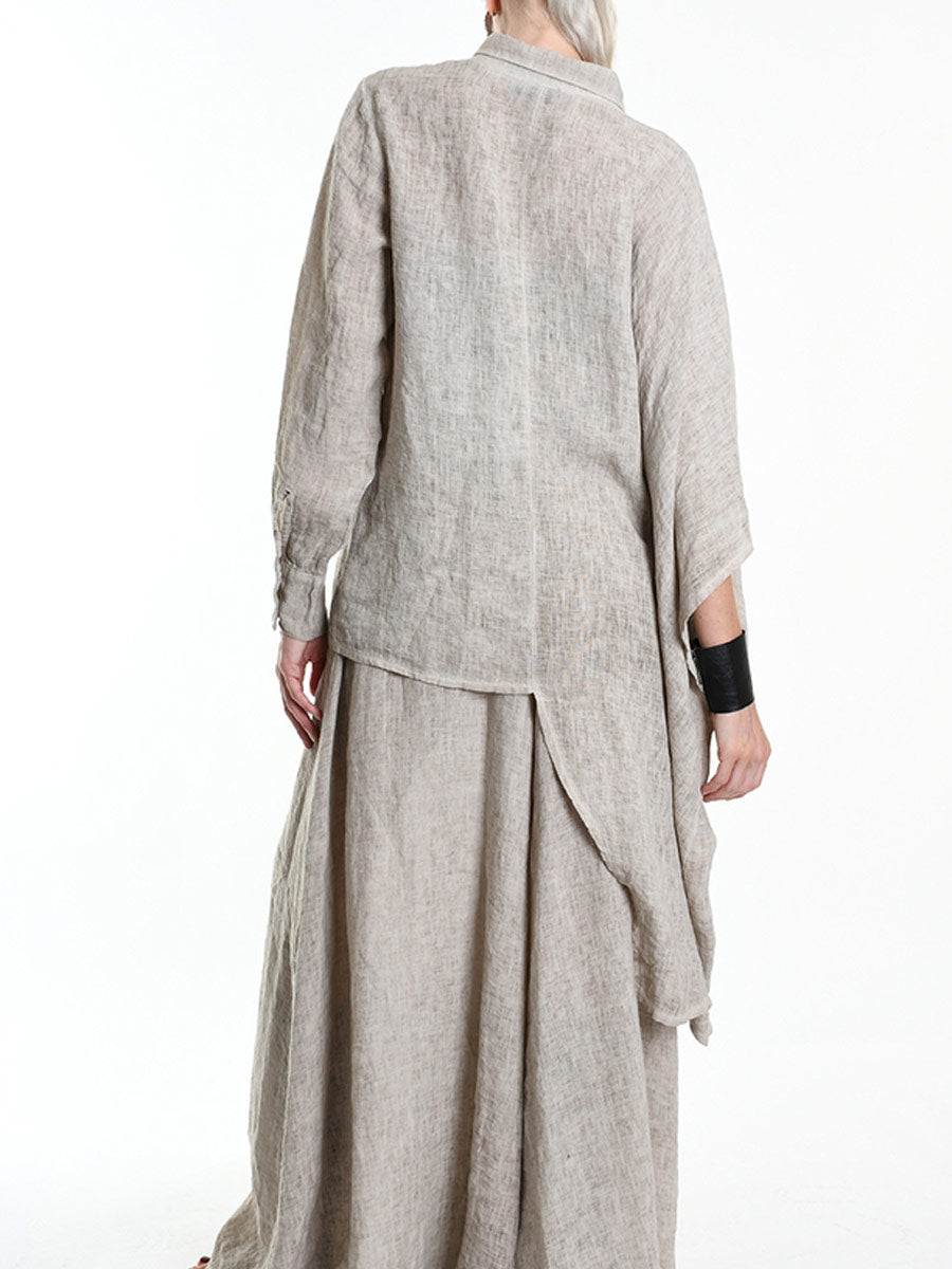 Bold look button through asymmetric linen shirt with long sleeve & aysmmetric cape sleeve, draped to longer length