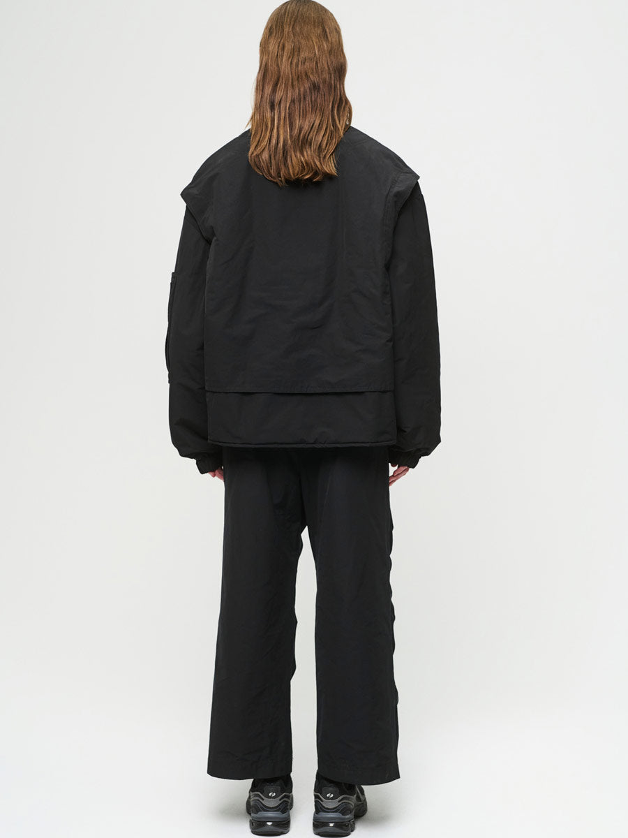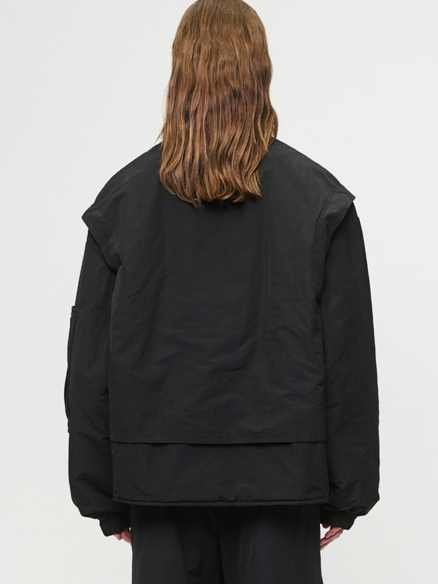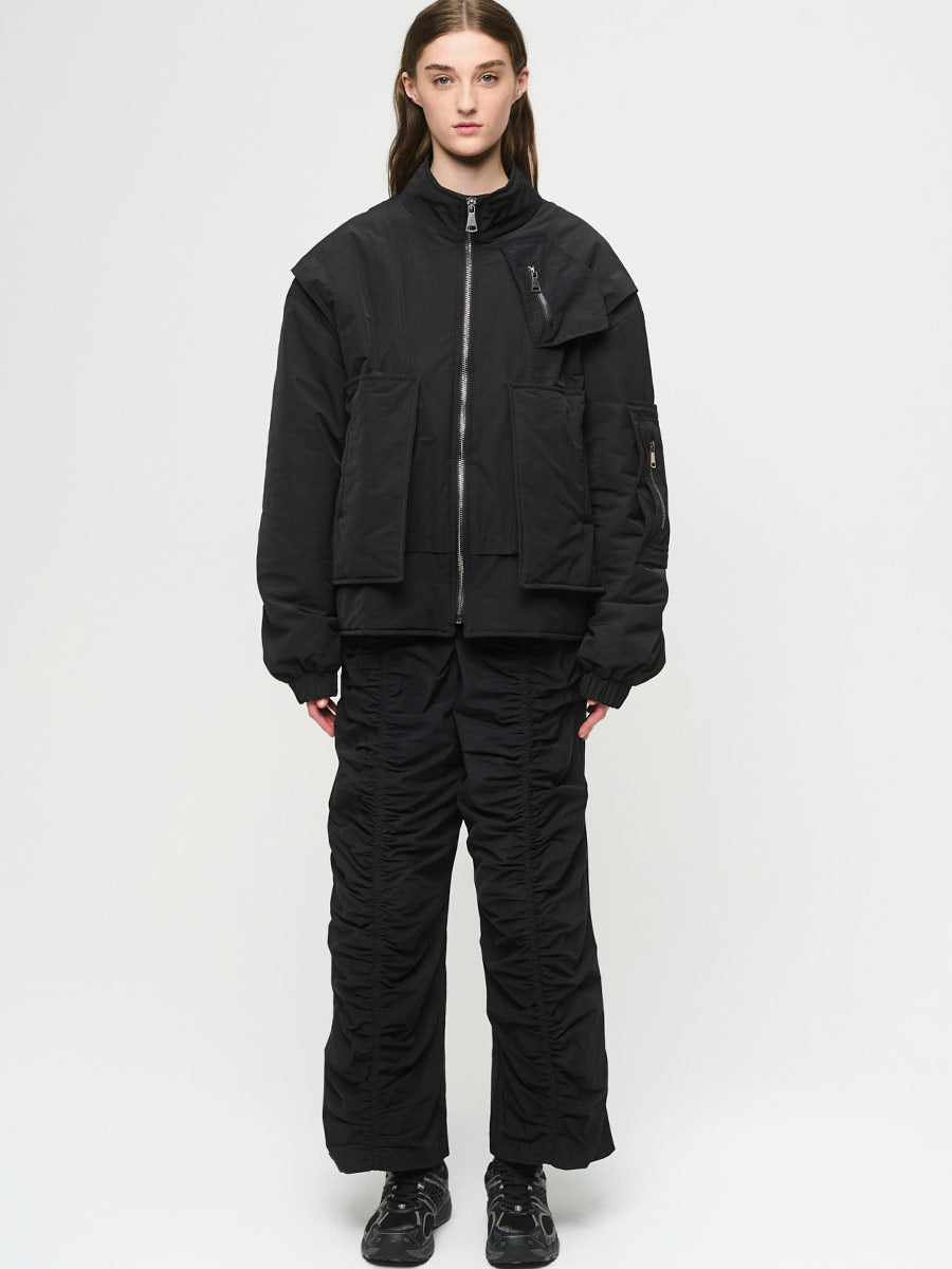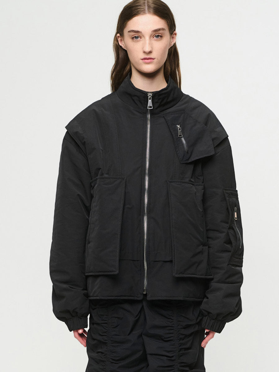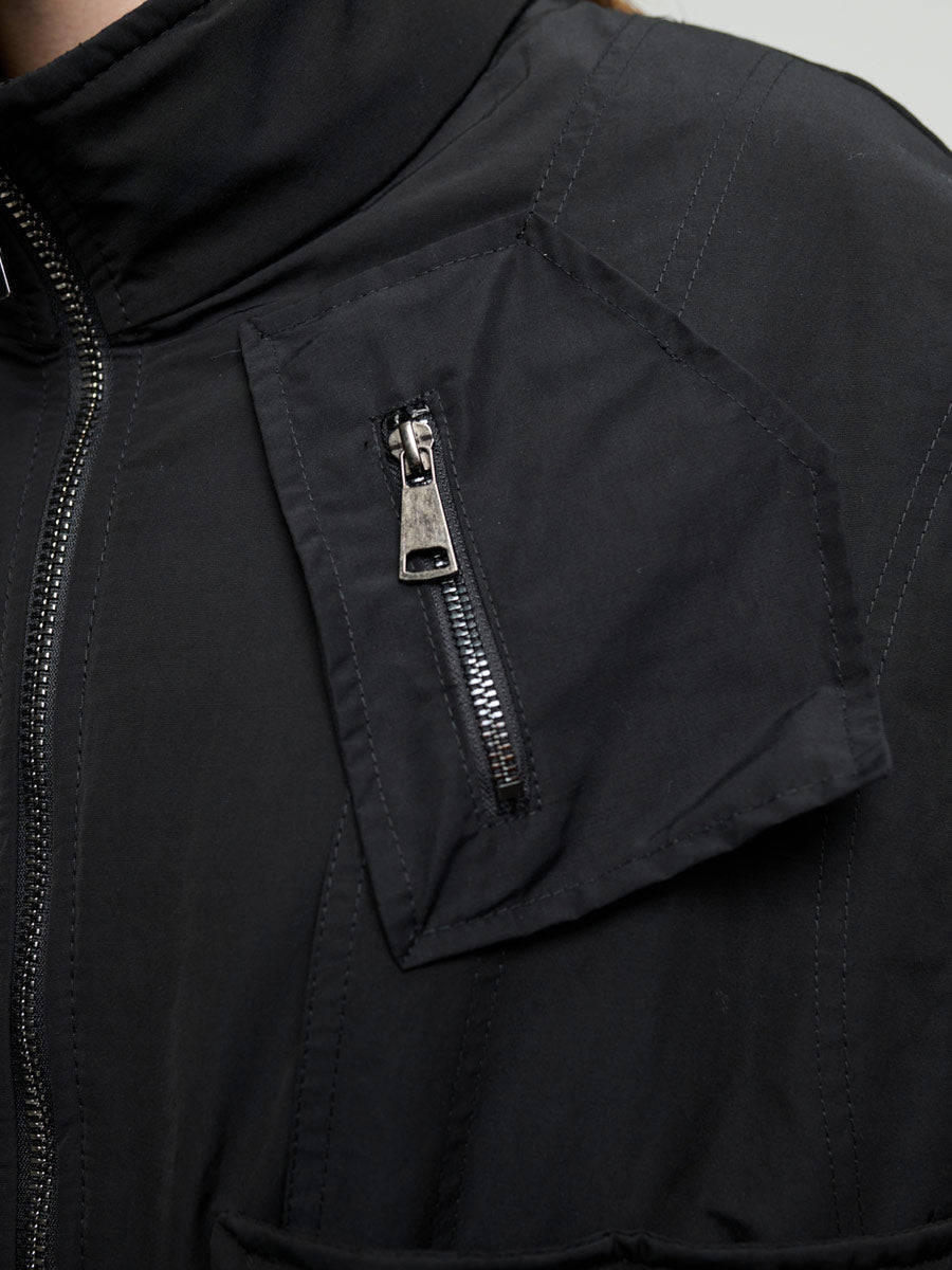 • Overlap on shoulder detailing, plus small zip pouch pocket 'epaulette' on one shoulder, and larger zip pocket on arm