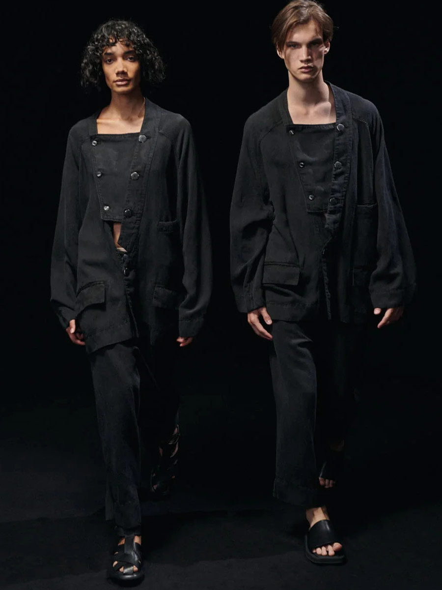 Heavy linen cut wide leg pant with double button fastening over front zipped fly.  Relaxed fitting with elasticated waistband at the back with featured belt loops, with additional detailing; side slit pockets; and a heavy hem on bottom, with option for turnup.