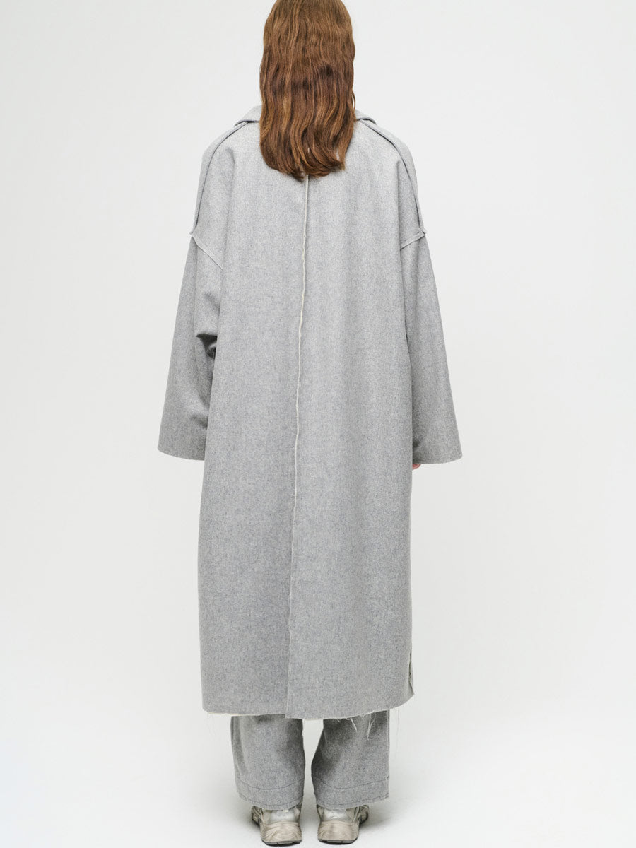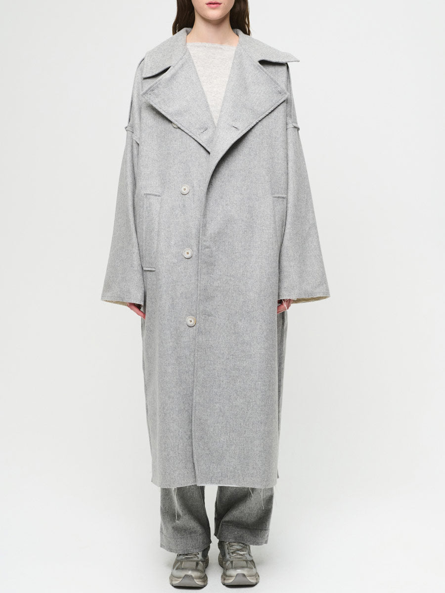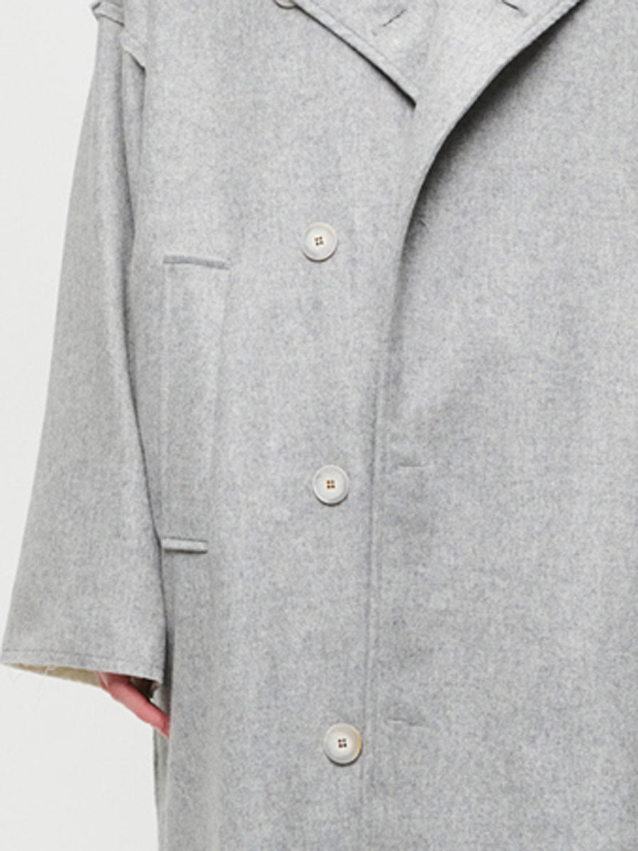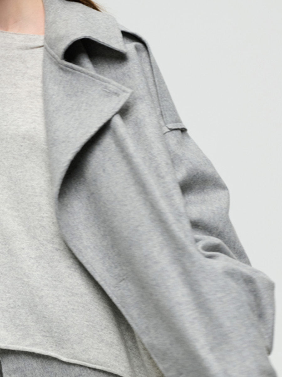 • Option 1: Lightweight, soft wool mix grey coat with wide revere flat collar to V opening