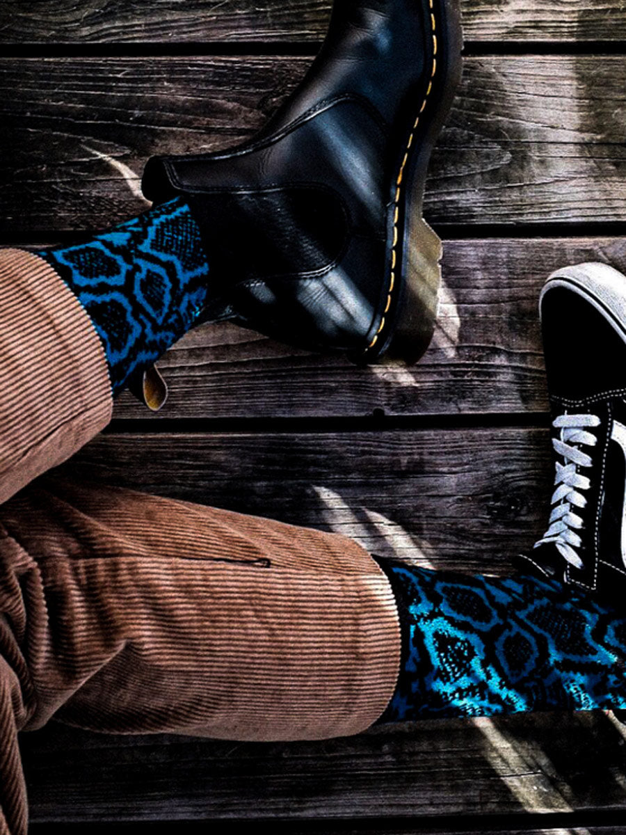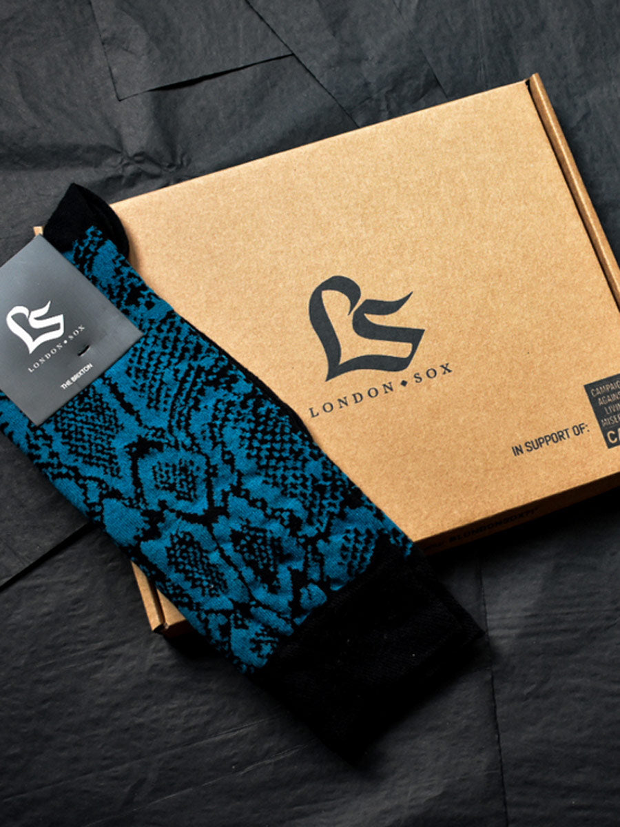 Black & blue snakeskin sock. The Brixton pairs perfectly with a boot or shoe for a slightly smarter look. Comfortable and durable, keeping your feet warm in the winter and cool in the summer.