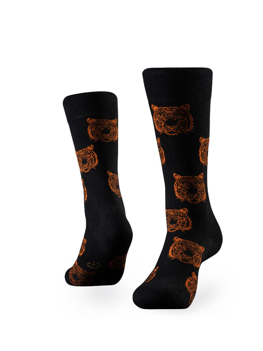 Black & Orange tiger sock. Inspired by tiger tattoos, the Peckham looks fresh with black jeans and shoes or trainers. Comfortable and durable, keeping your feet warm in the winter and cool in the summer.