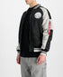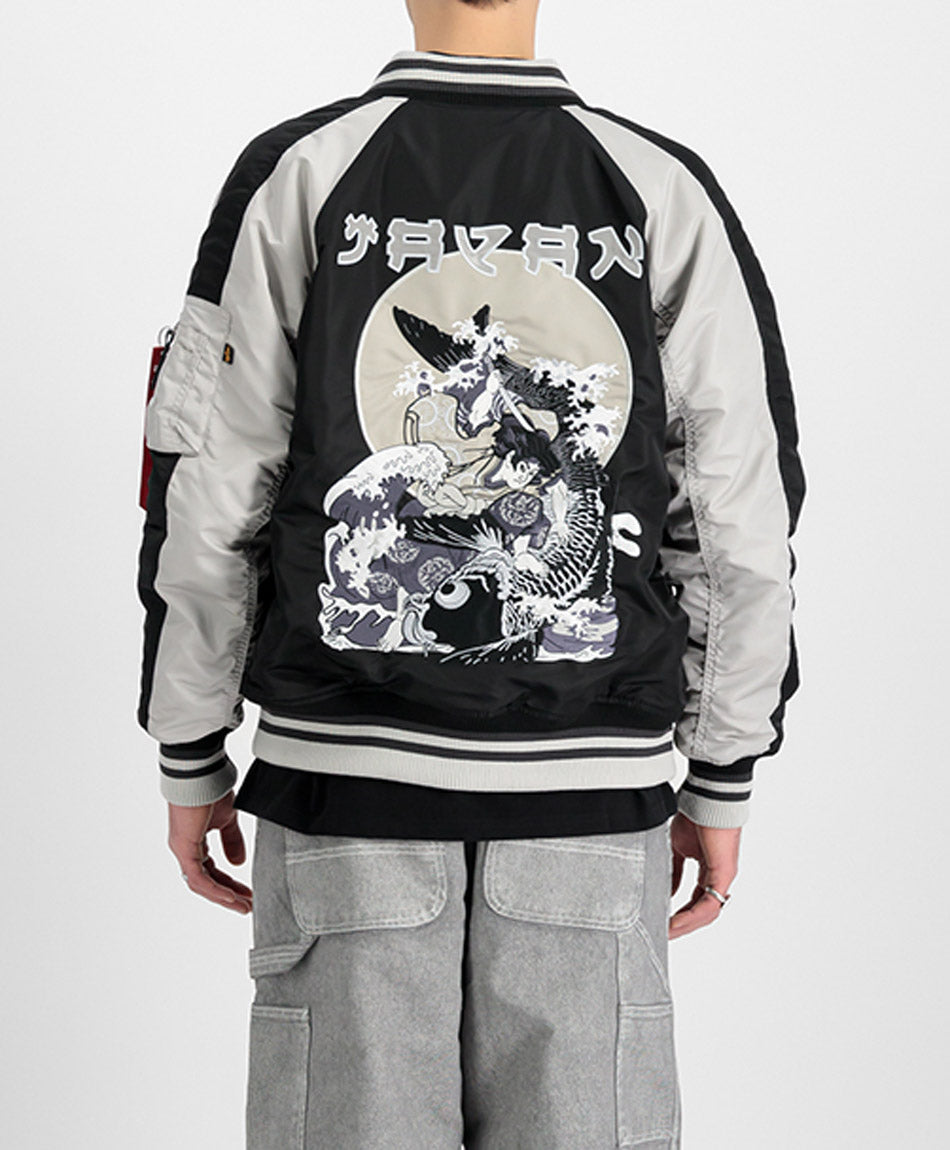 Alpha Industries MA-1 Japan Warrior Souvenir Jacket. Classic MA-1 bomber shape featuring raglan sleeve with panel detailing and badge on chest. Japan embroidered back panel detailing makes this jacket truly stand out the signature Remove Before Flight Tag on sleeve pocket zip through detailing as well as stripe detail on knitted collar and cuffs with added lower waistband to ensure you stay warm when needed. Made from 100% cotton.
