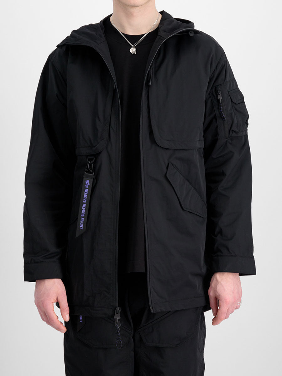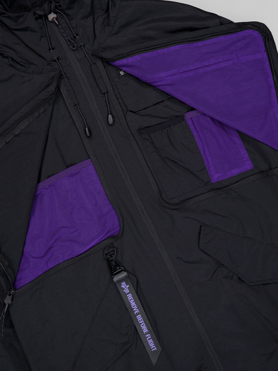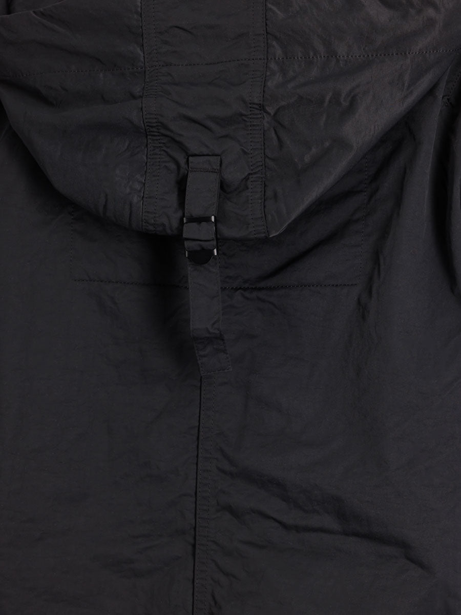 Constructed from lightweight carbon cotton with a semi-shining surface. The adjustable hood detail adds practicality to the design while utility chest pockets featuring zipper closures and contrast mesh sit behind a zip fastening flap detail. The two front-side entry pockets are enhanced with magnetic snap-closing pocket flaps. A two-way zipper ensures excellent functionality while the UV keyring detail with carabiner closures on the D-ring detail adds a distinctive touch. The drawstring hem and magnetic cuff closing complete the look.