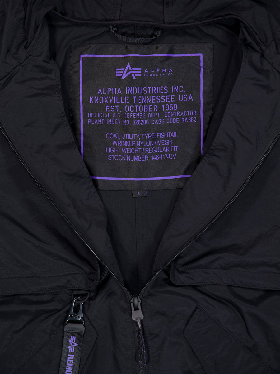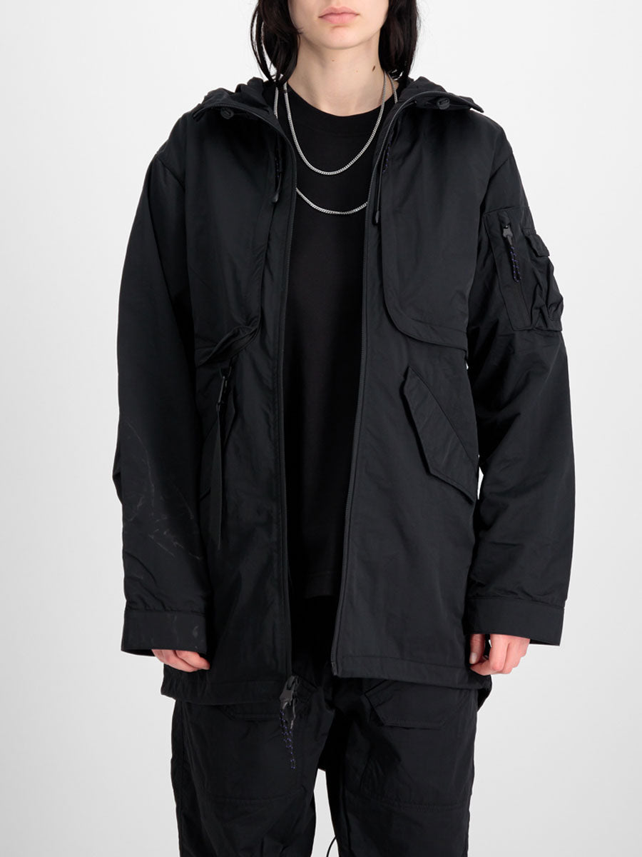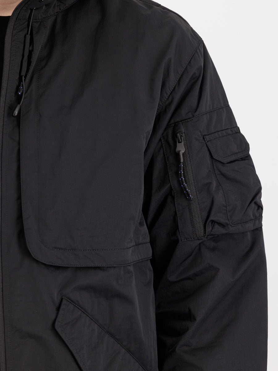 Constructed from lightweight carbon cotton with a semi-shining surface. The adjustable hood detail adds practicality to the design while utility chest pockets featuring zipper closures and contrast mesh sit behind a zip fastening flap detail. The two front-side entry pockets are enhanced with magnetic snap-closing pocket flaps. A two-way zipper ensures excellent functionality while the UV keyring detail with carabiner closures on the D-ring detail adds a distinctive touch. The drawstring hem and magnetic cuff closing complete the look.