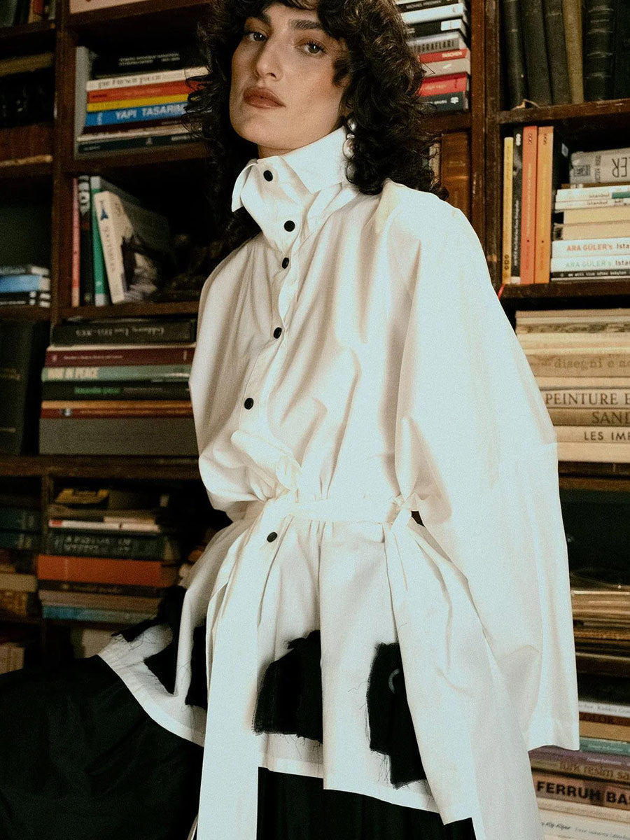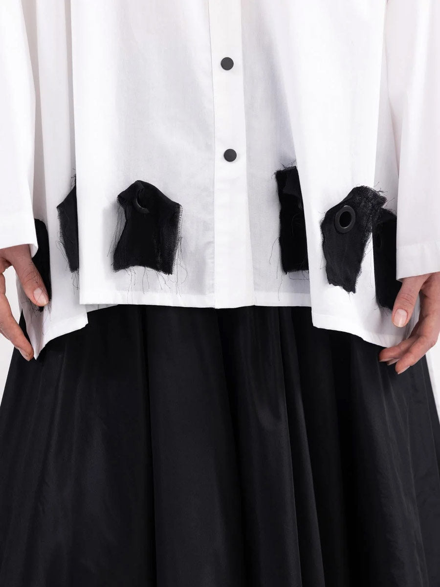 Striking oversized over shirt in white cotton with dramatic black accent detailing