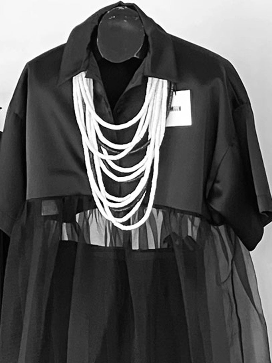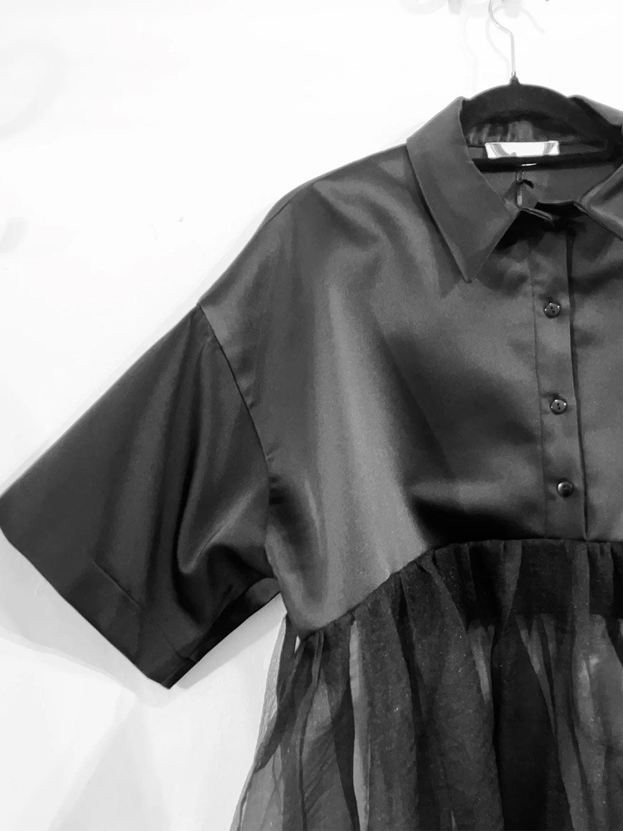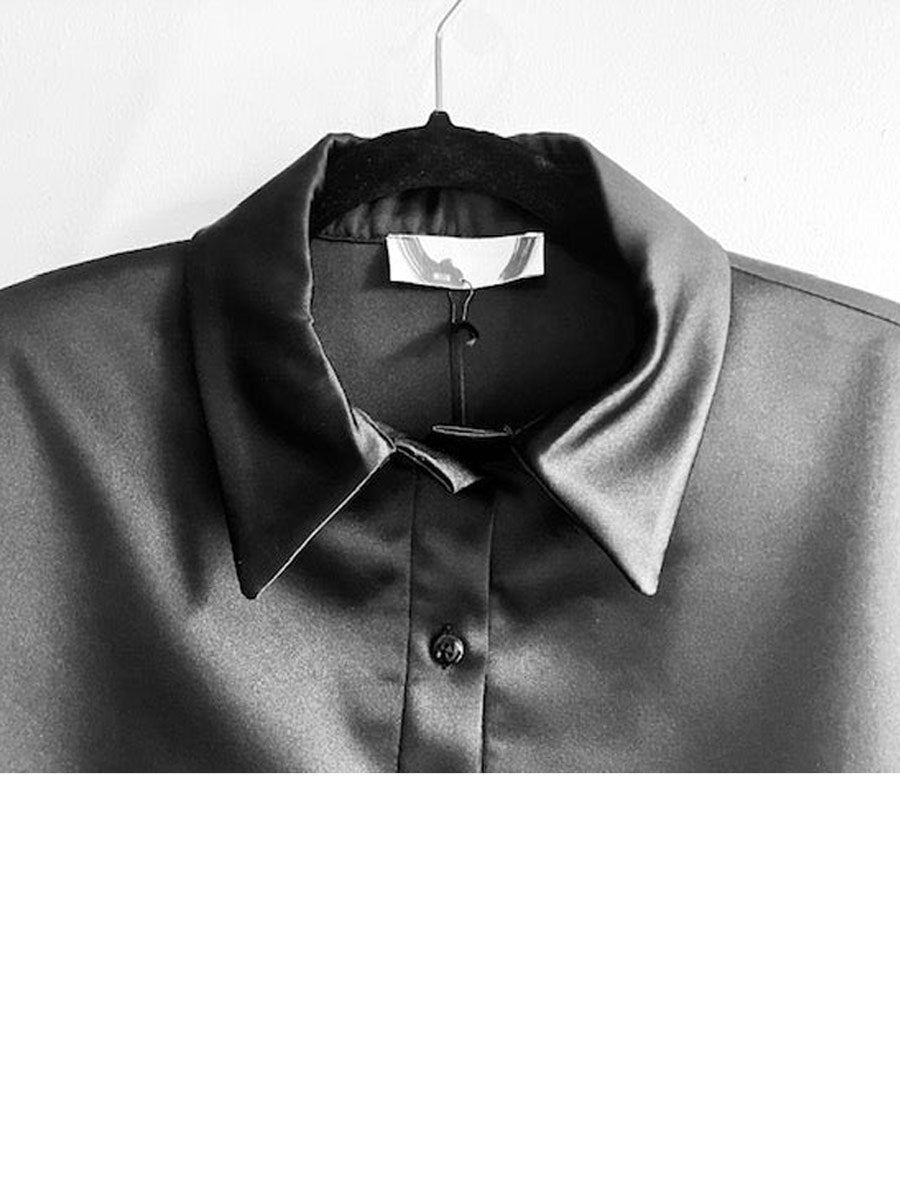 • Over shirt with short satin top, with collar and buttons down front. Fully lined