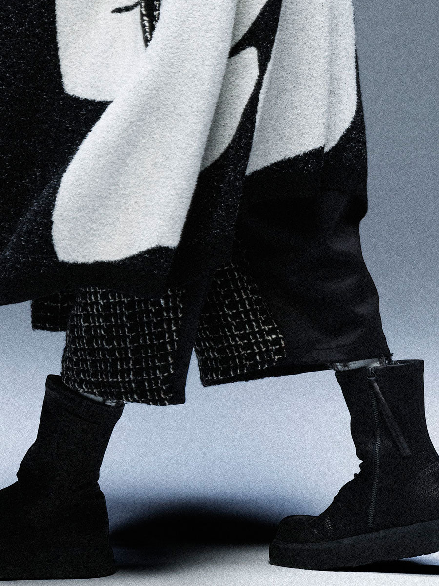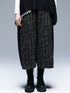 Bold wool mix fabric in a cool wide legged easy fit japanese style pant.   Slight wide palazzo styling into a cut off leg length - inner lining for comfortable wearing, elasticated waistband with belt runners - pockets at side seam.   Back of pant in a heavy slight satin look jersey , in plain black.