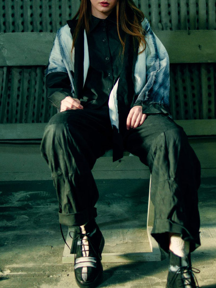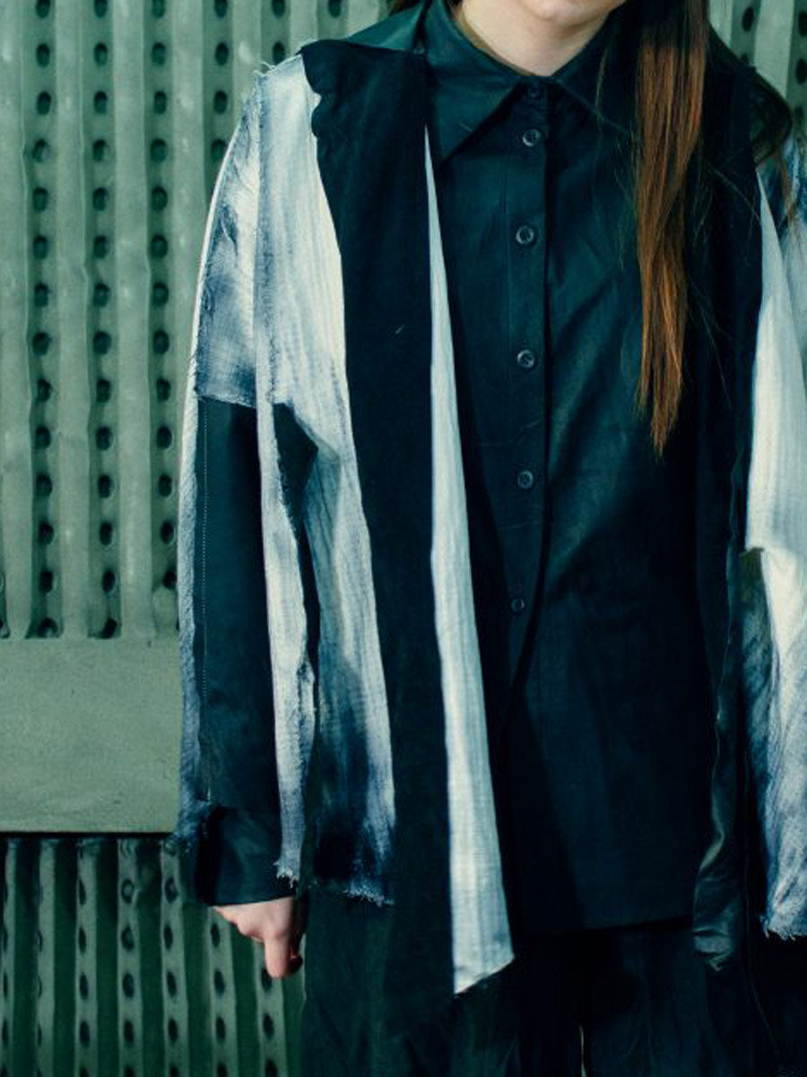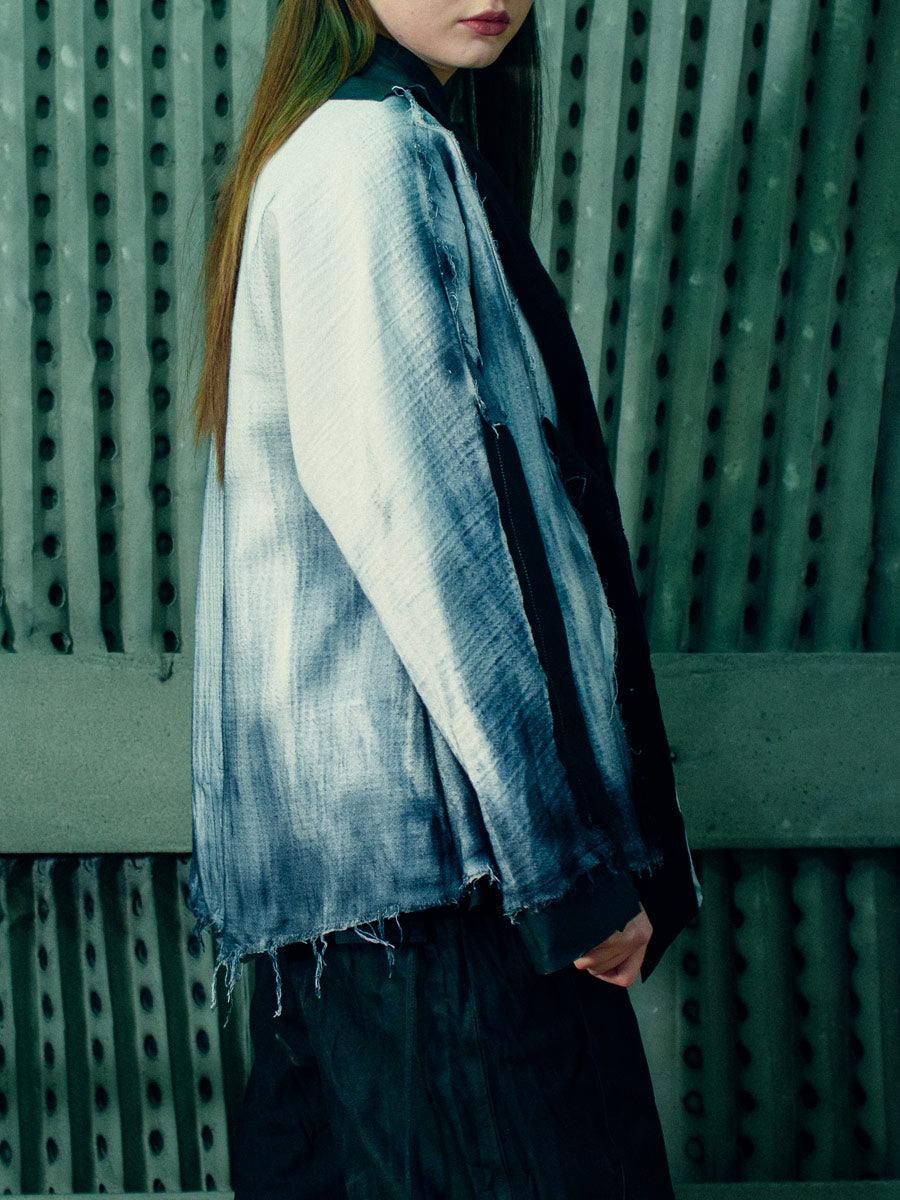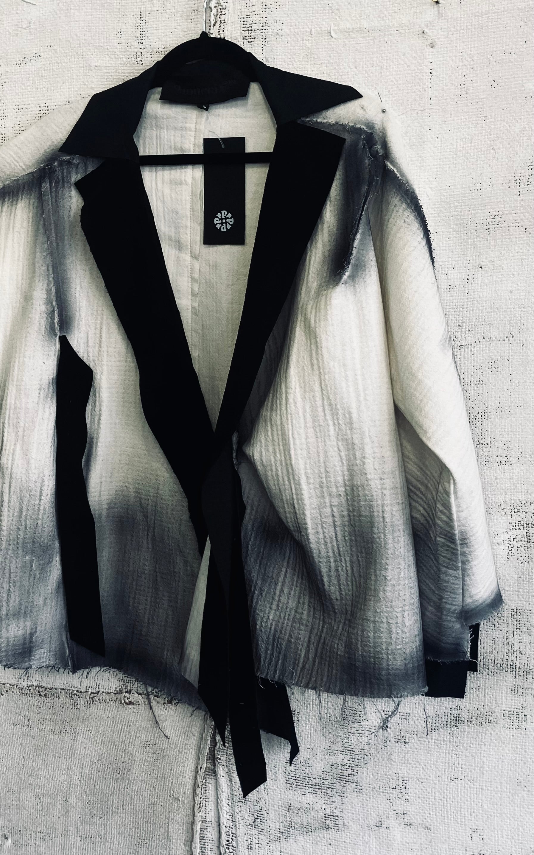 Edgy, cool, mid length jacket in Ecru, with Black and Ombre Black Dye detailing