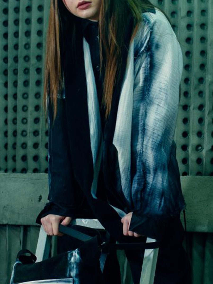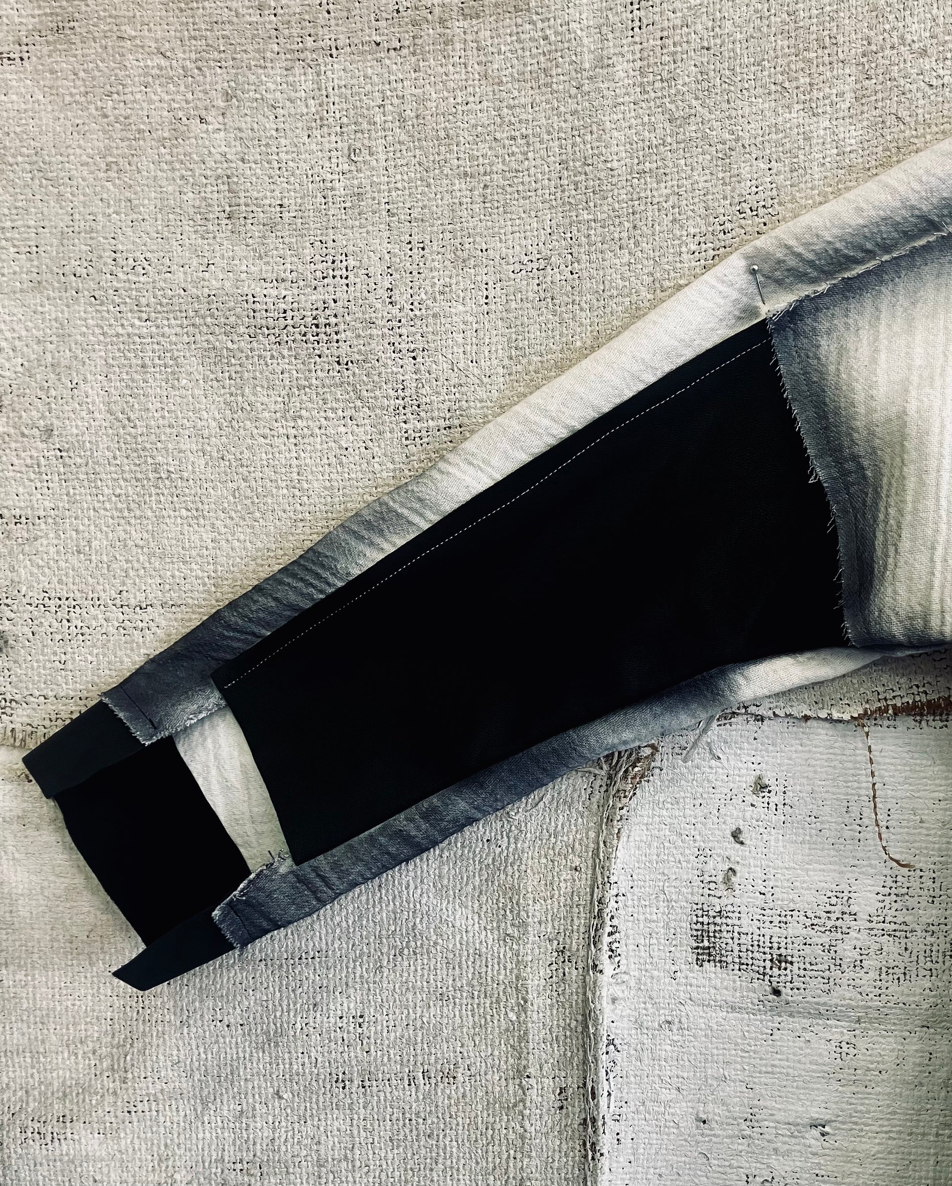• Ecru cotton main body, with stitched patch panels of cotton ecru with dyed grey ombre shading and raw edges; plus black leather panels
