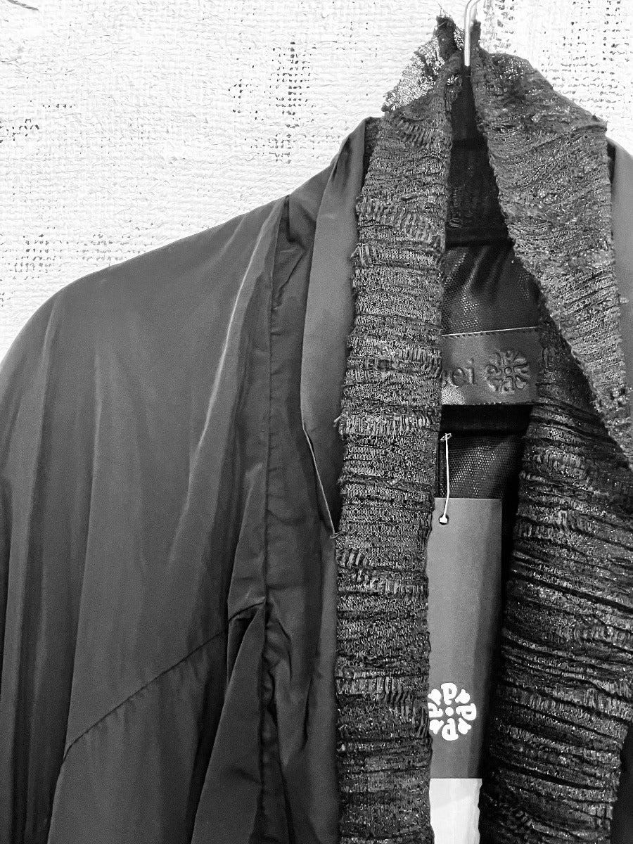 • Soft rever neck, with contrast sheer weave trim, inner layer