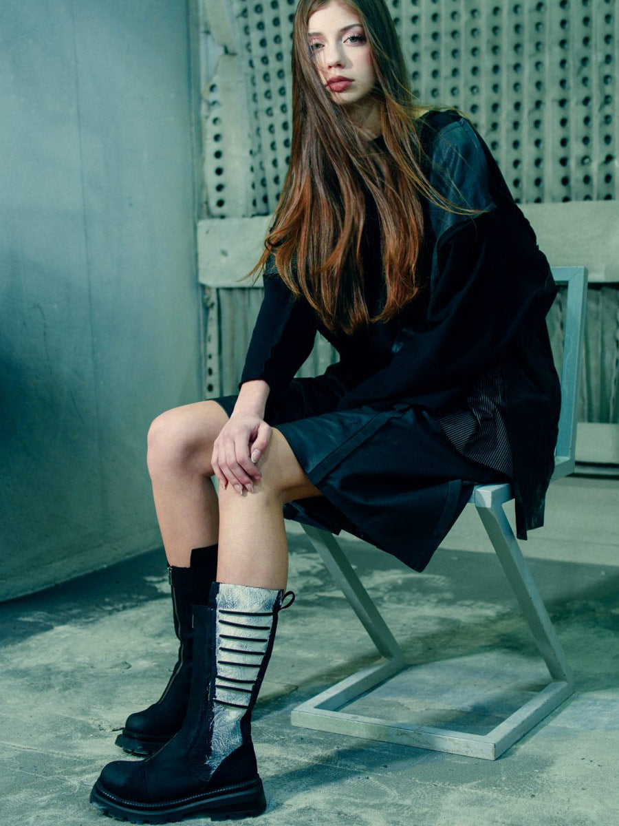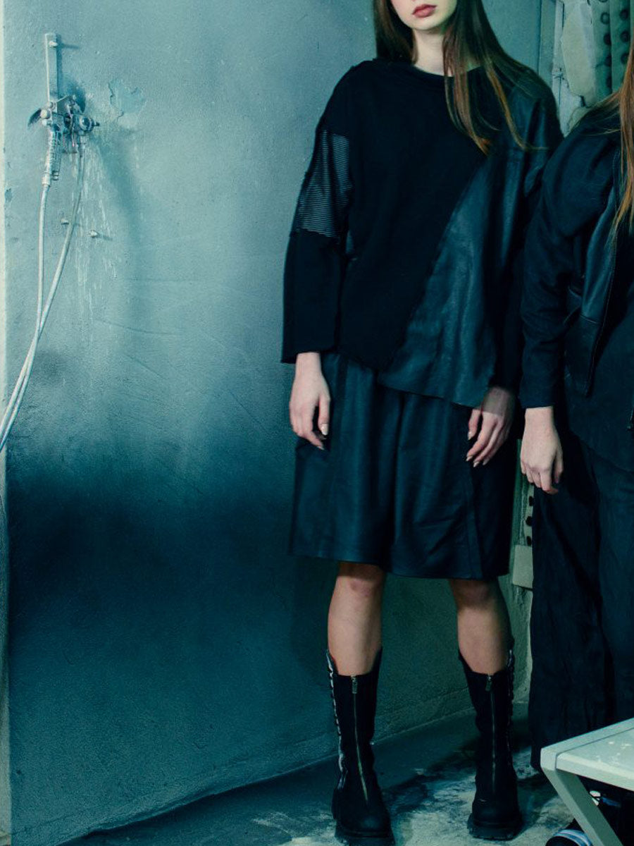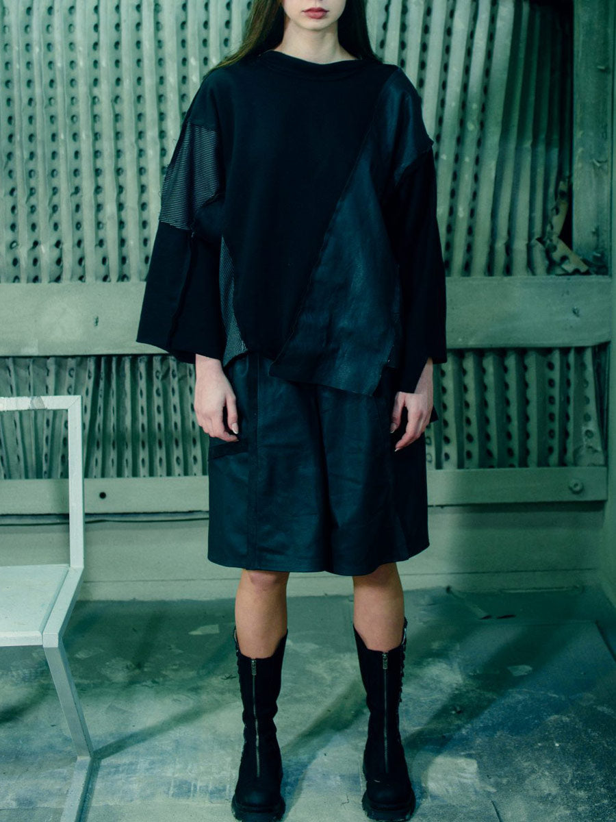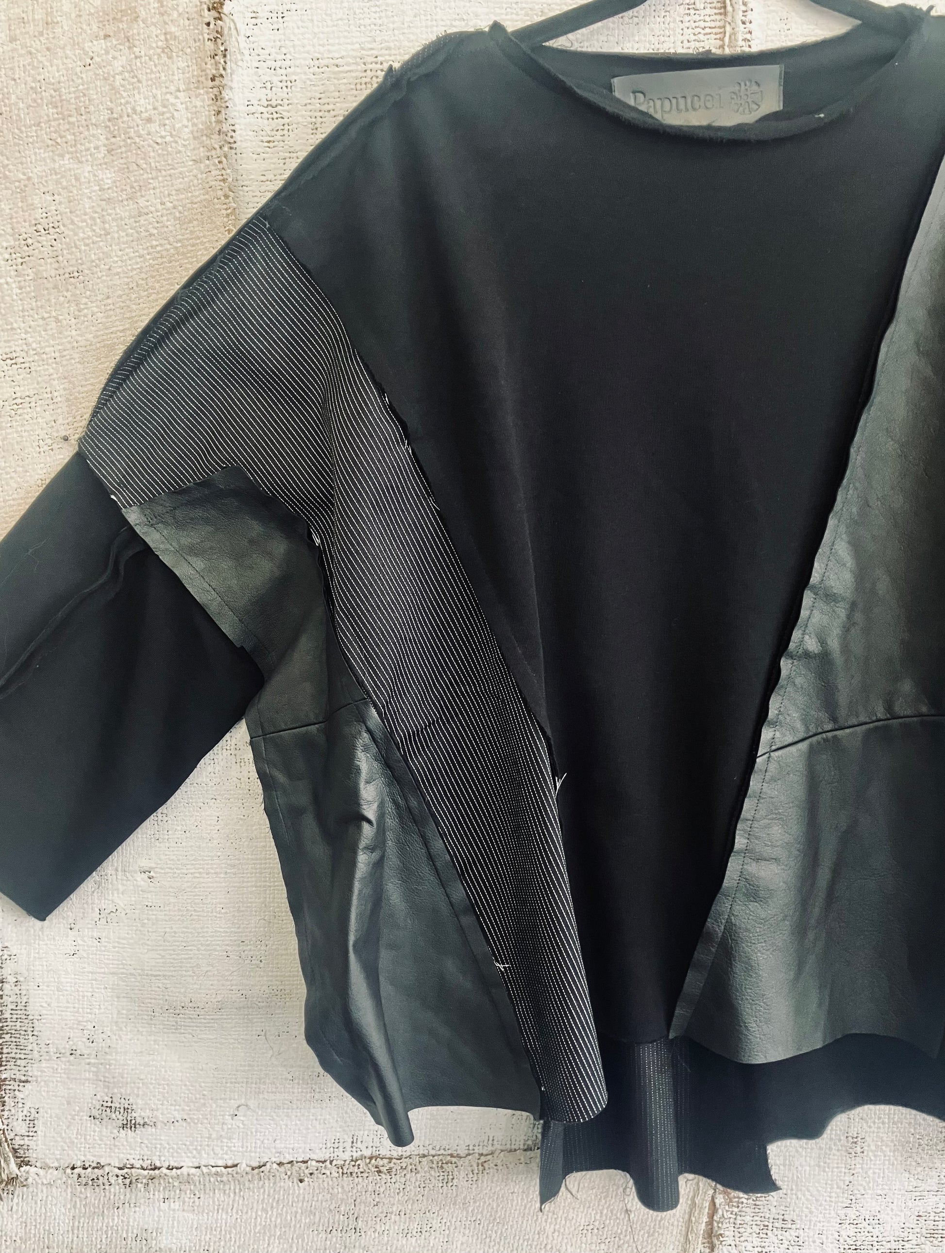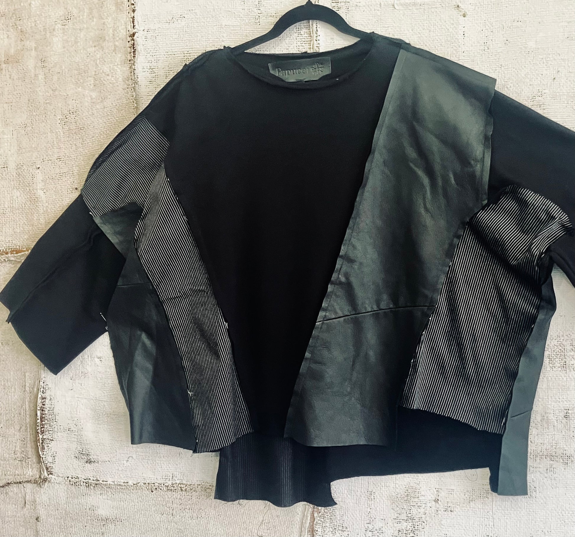 • Encorporating panels of leather and striped heavy cotton, with raw edge seam finishing for maximum effect and texture