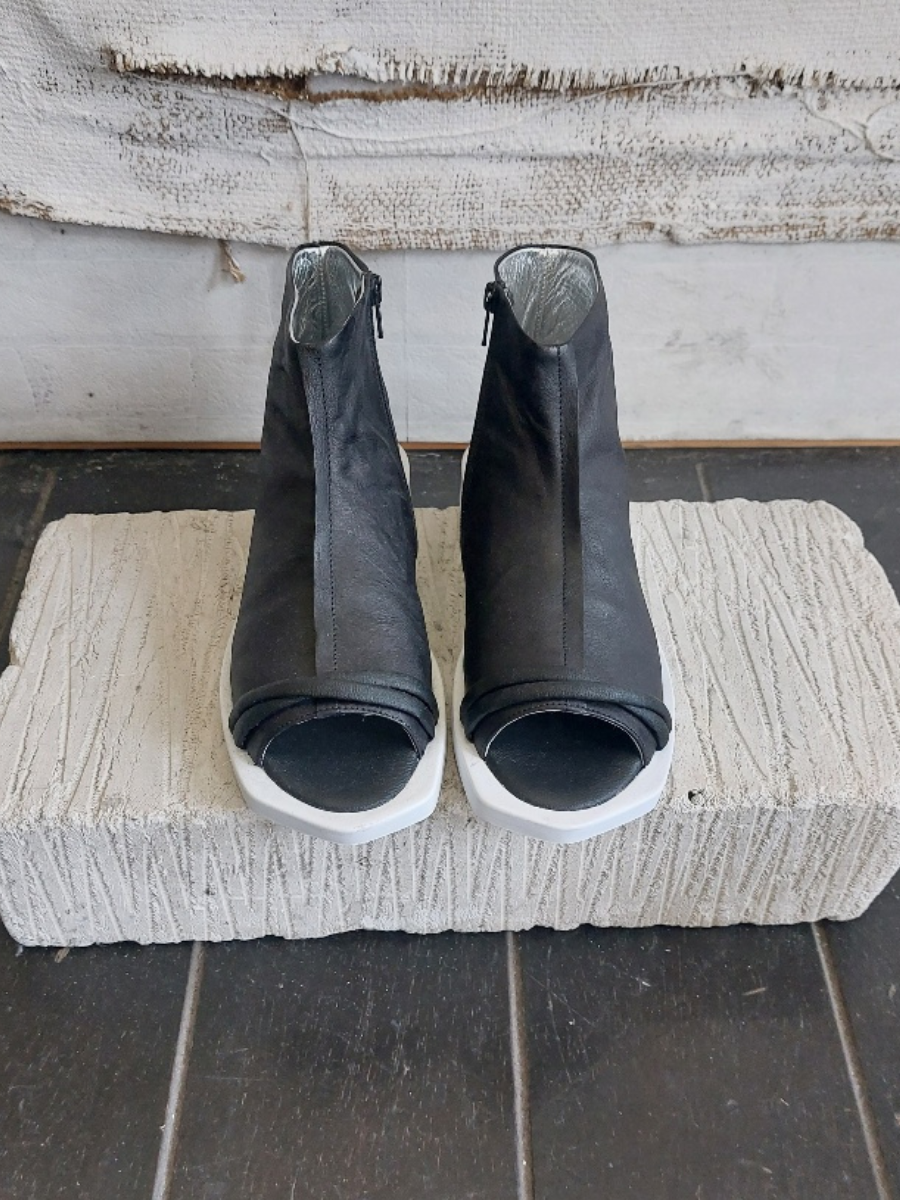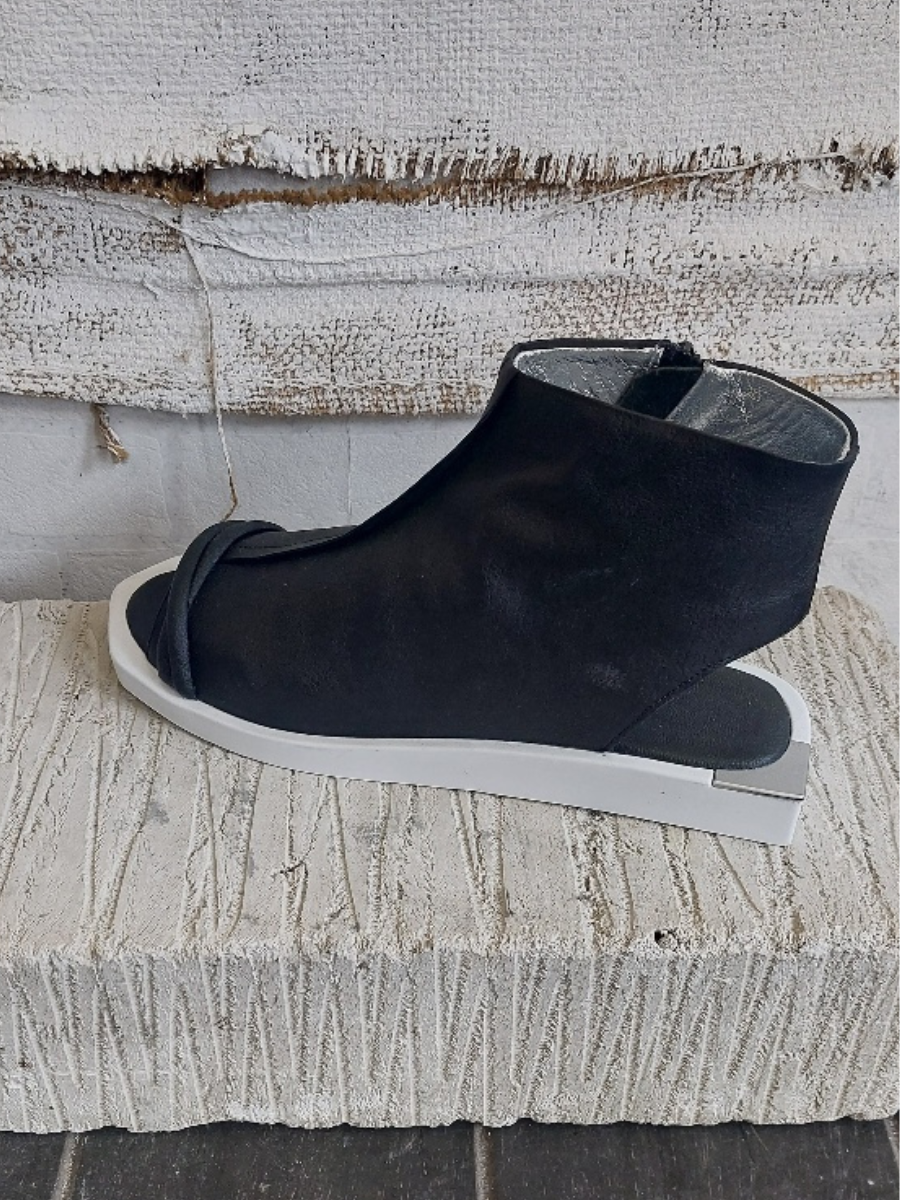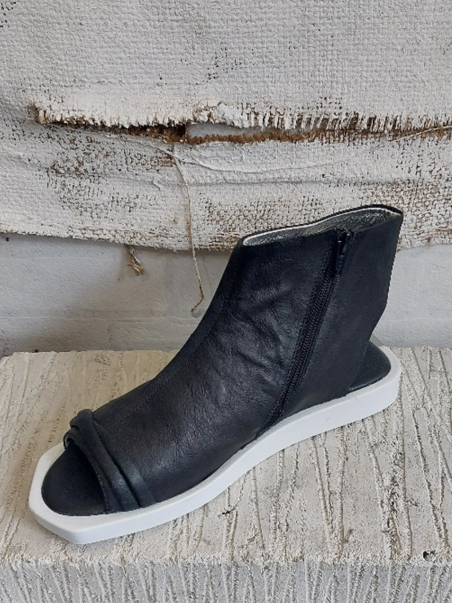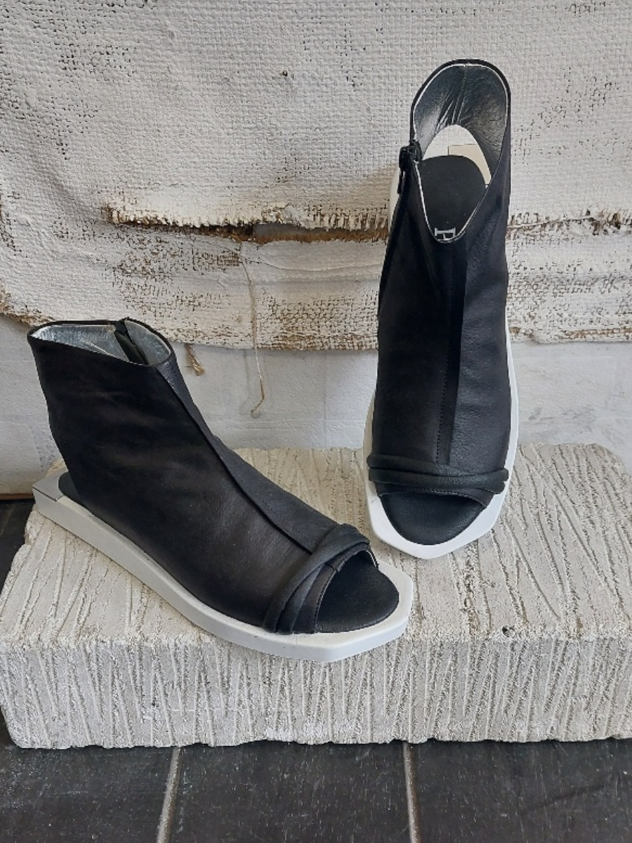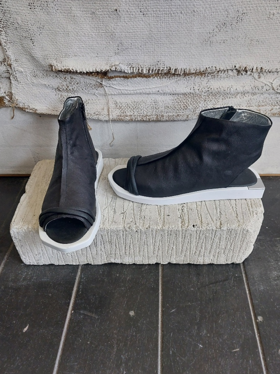Saphira is an open toed, open heal leather high top sandal/boot that features a with leather piping detail across the middle. It has an inside zip and uniquely designed stunning white sole, with small metallic grey detail by heal that matches the metallic inner lining