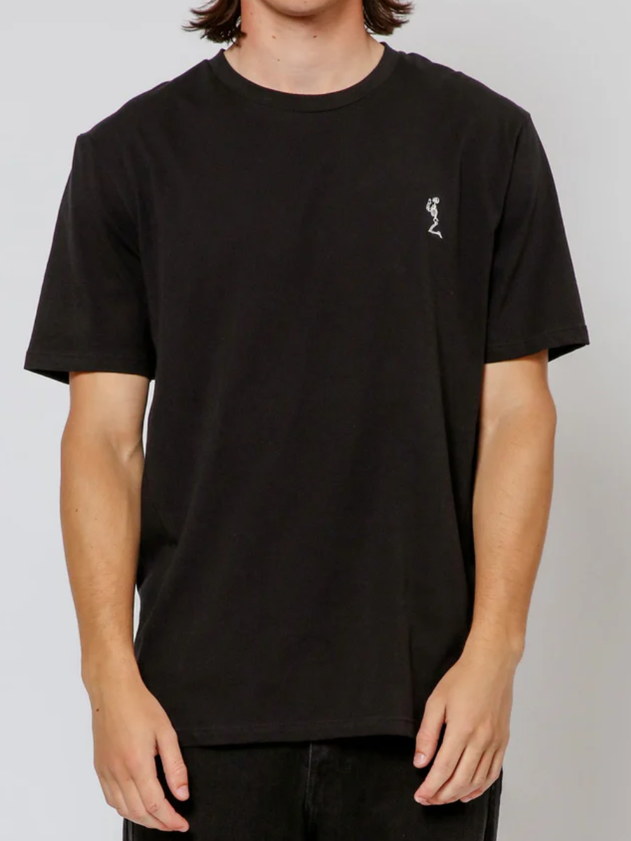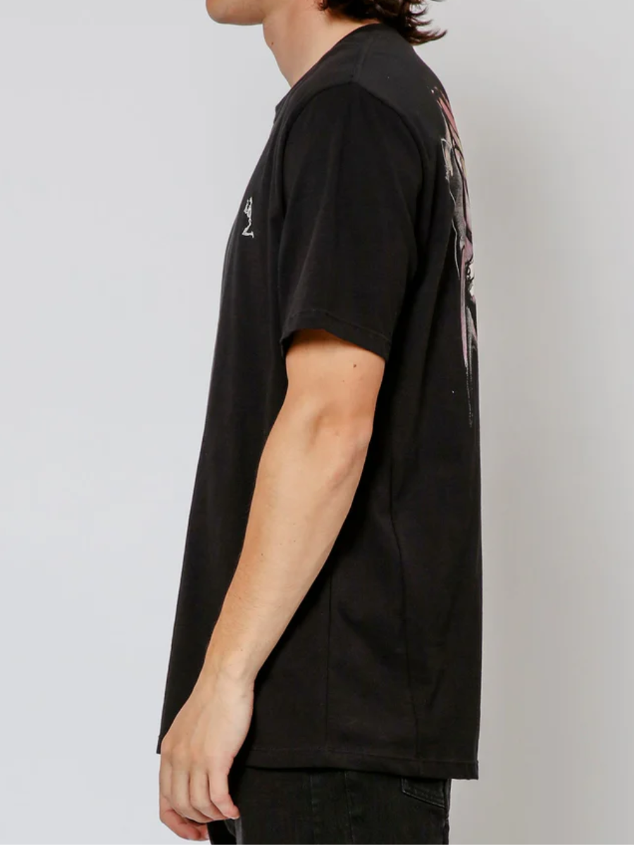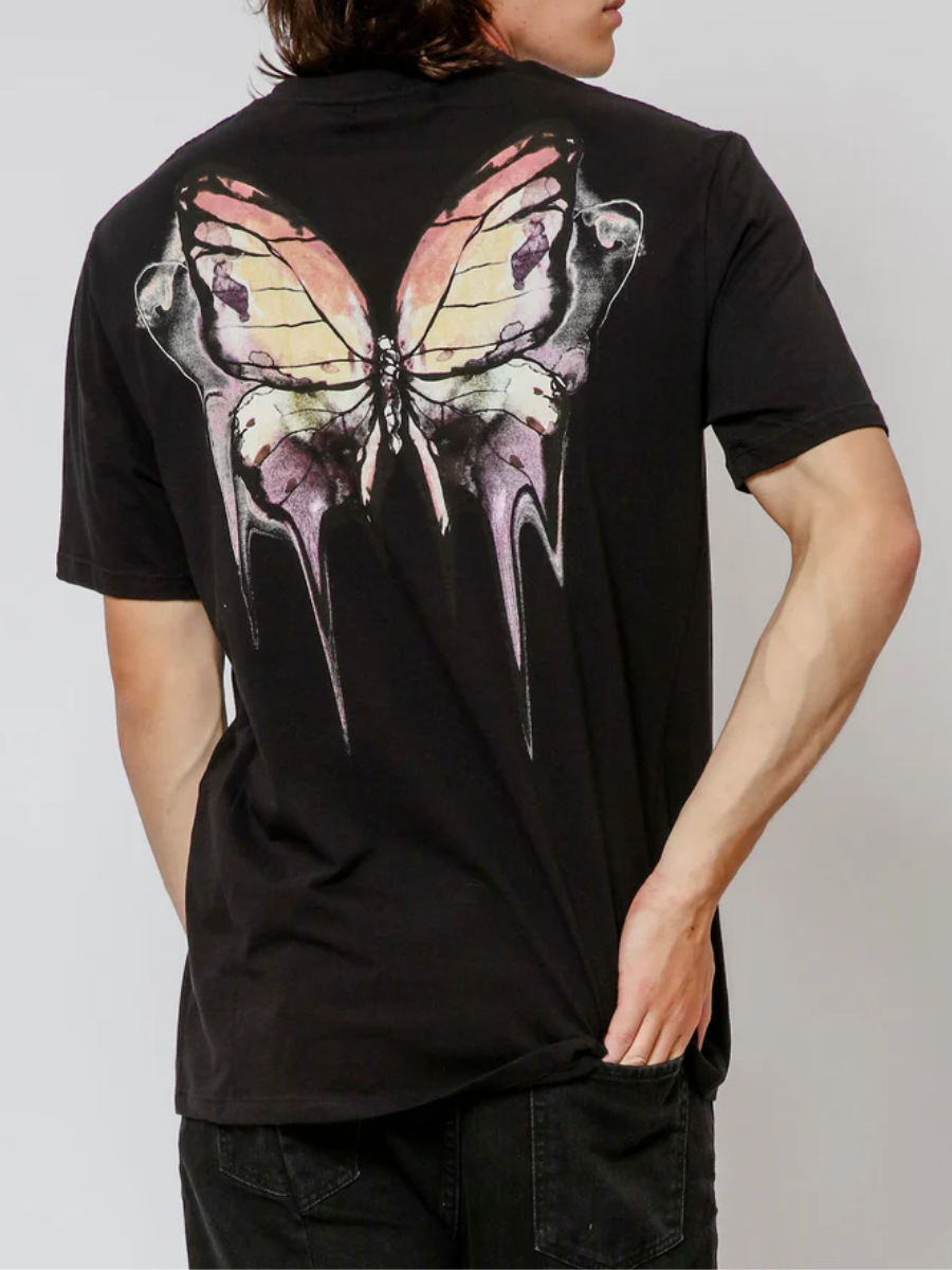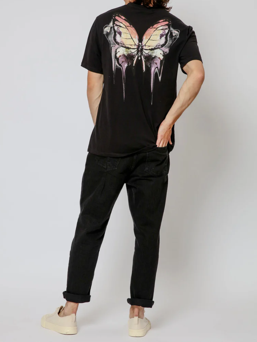 The Butterfly T-Shirt. Shaped to a regular fit in black. Featuring a butterfly graphic on the back and the embroidered praying skeleton sits on the front.