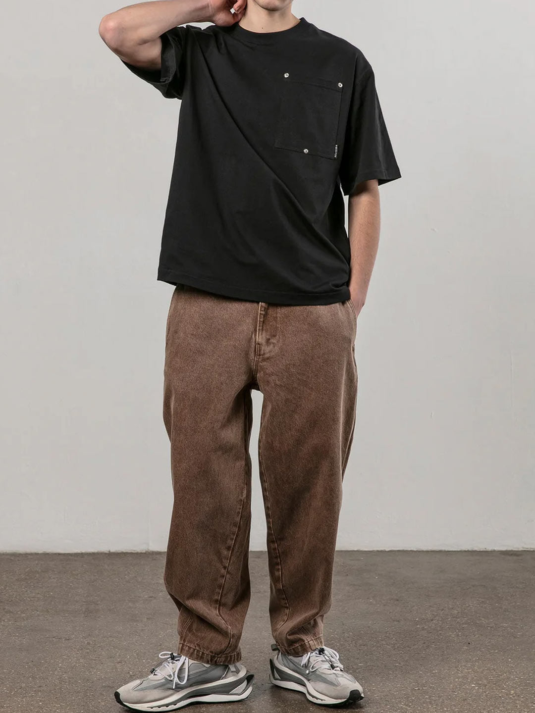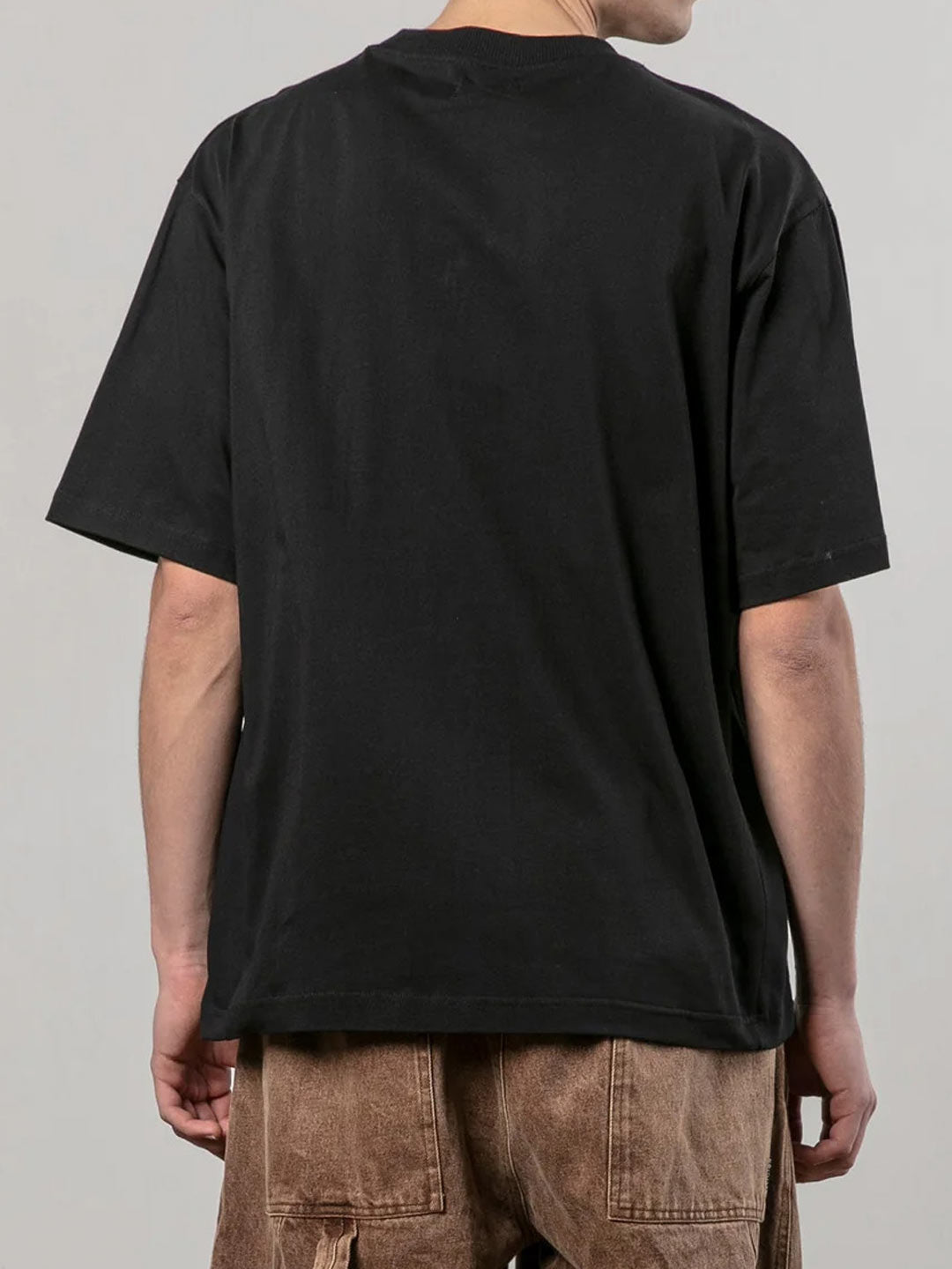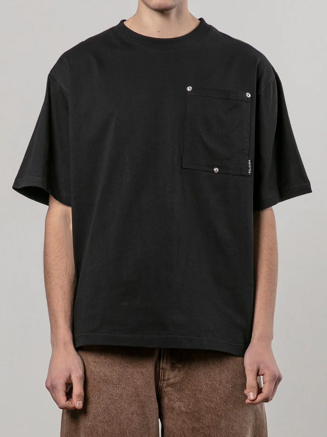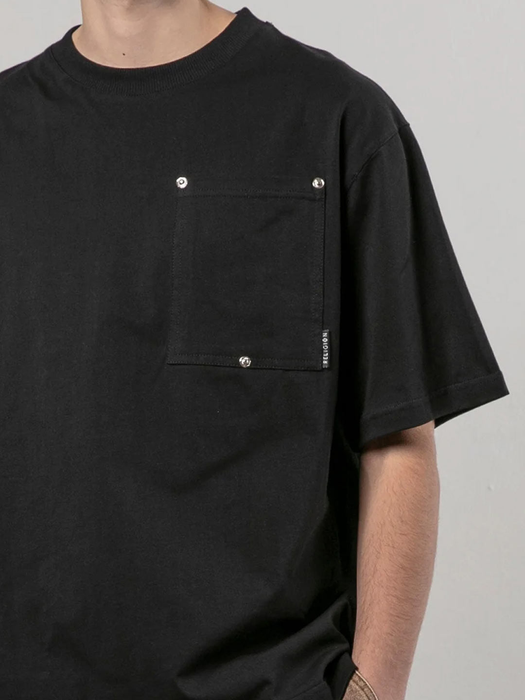 Crafted from heavy jersey, the black Rivet T-Shirt boasts an oversized fit that's perfect for comfort. It's complemented by a riveted chest pocket featuring the signature RELIGION tab branding, and front and back darts that give it a tailored appearance. To top it off, the ribbed crew neck makes this an elegant simple piece for any wardrobe.