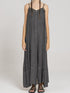 Fabulous distressed grey, full length easy fit dress. Features rounded neck and dropped shoulders to short sleeves, with 'tiered' detailing and deep arm holes. Fabric tie belt adds to casual easy wear styling. Frayed raw edges to neck, sleeves and hem detailing.