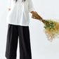Utterly delightful relaxed fit, wide leg, cropped trousers in lightweight soft and silky cotton mix. Comfy elasticated waist at back, with flat front, button opening, with concealed zip. Gorgeous styling with box pleat detail from the waist front and side seam pockets, plus a single back patch pocket. Wide legs feature a deep stitched turn up hem.