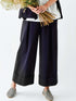 Utterly delightful relaxed fit, wide leg, cropped trousers in lightweight soft and silky cotton mix. Comfy elasticated waist at back, with flat front, button opening, with concealed zip. Gorgeous styling with box pleat detail from the waist front and side seam pockets, plus a single back patch pocket. Wide legs feature a deep stitched turn up hem.