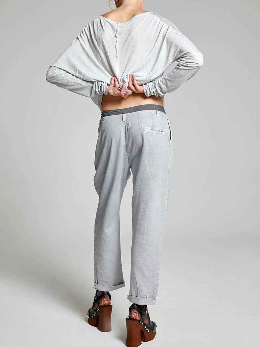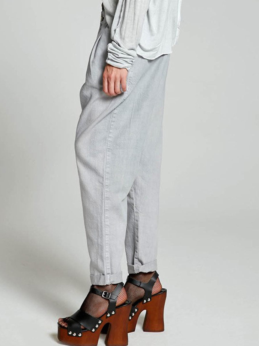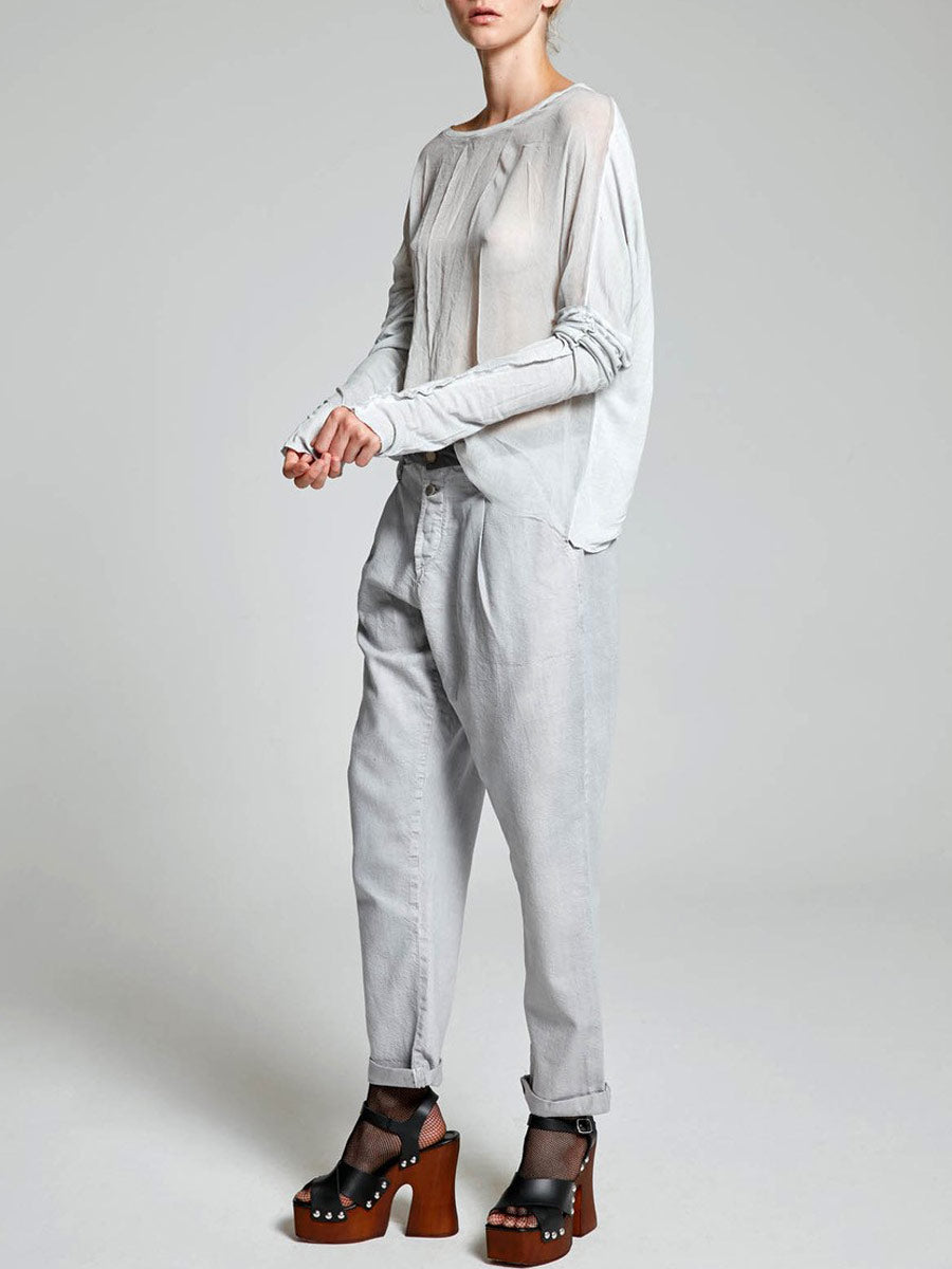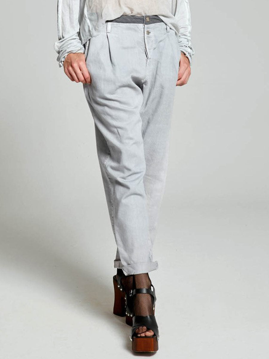 Washed out look heavy cotton pant in bluey grey.   Side slash pockets , pleated front into wide legs tapered to the ankle.  Funky manual turnups.   Fly front with button ffasting.  Handfinished details and stitching.