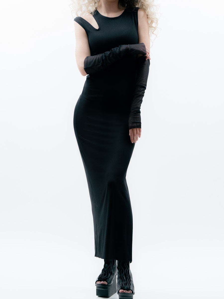 • Easy to wear, sleeveless, maxi dress in silky , soft black fine knit jersey.