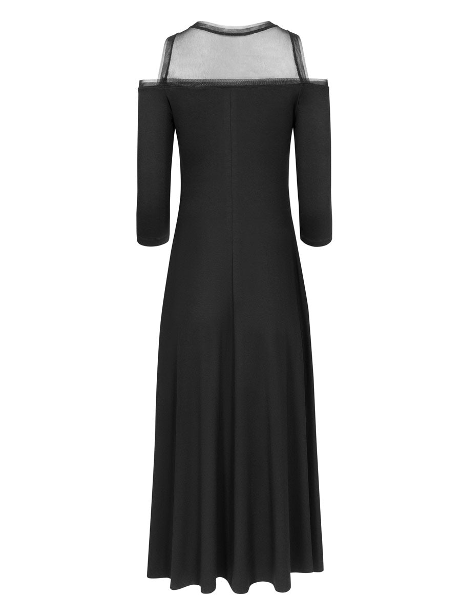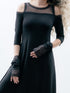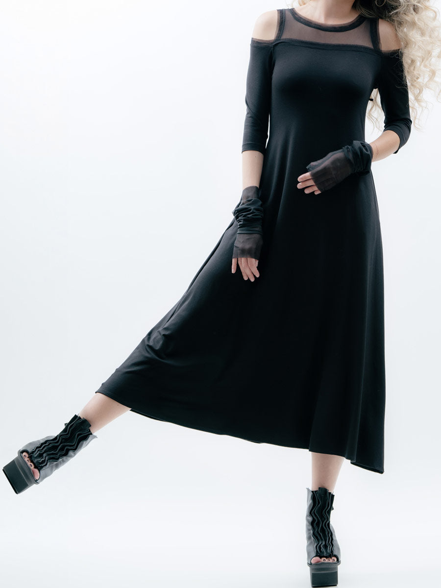 • Net panel detail from neck; a rounded collar with sheer raw net finishing; creating exposed shoulder look.