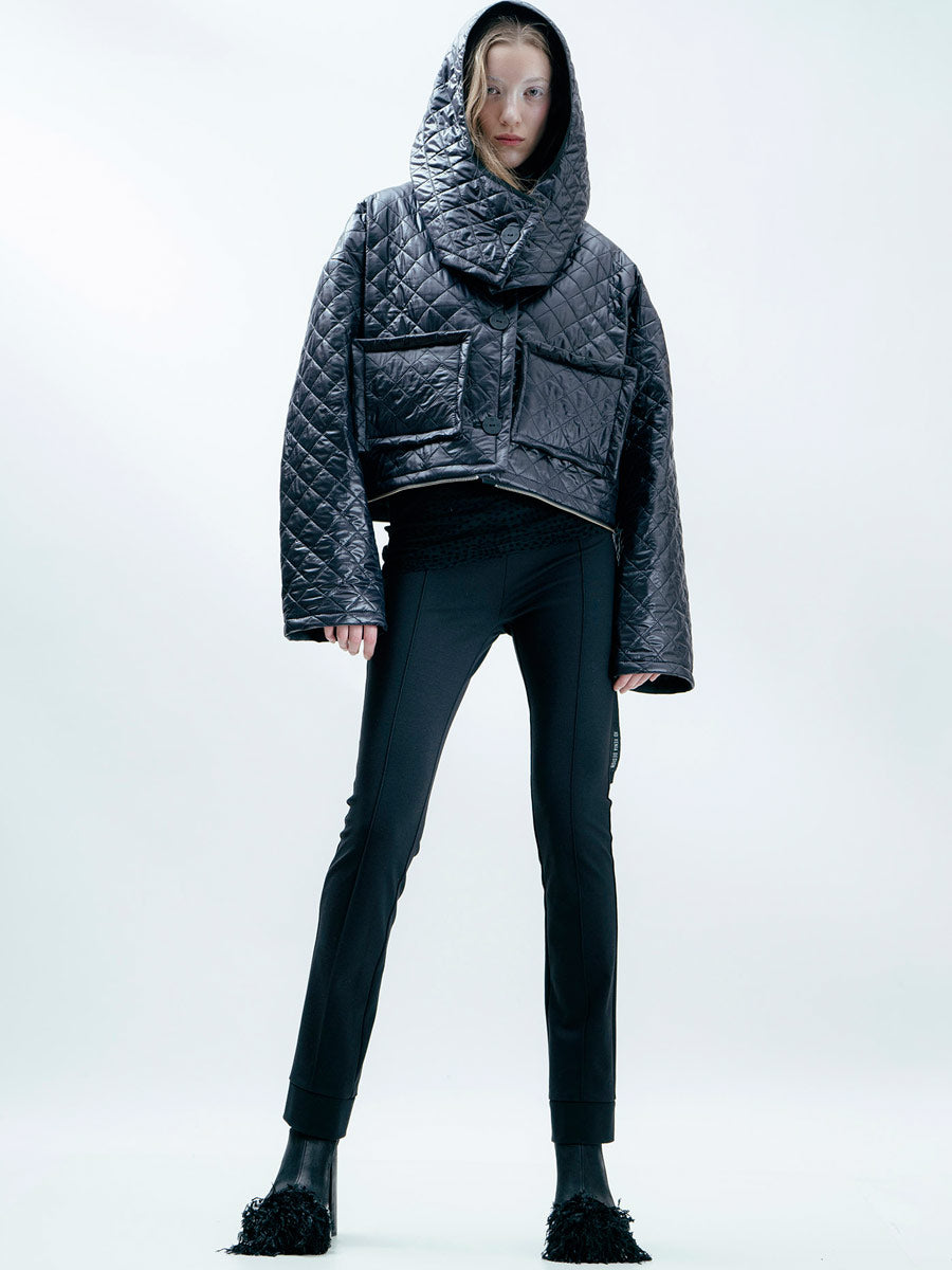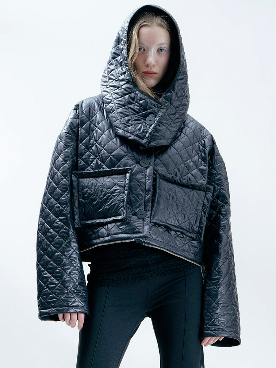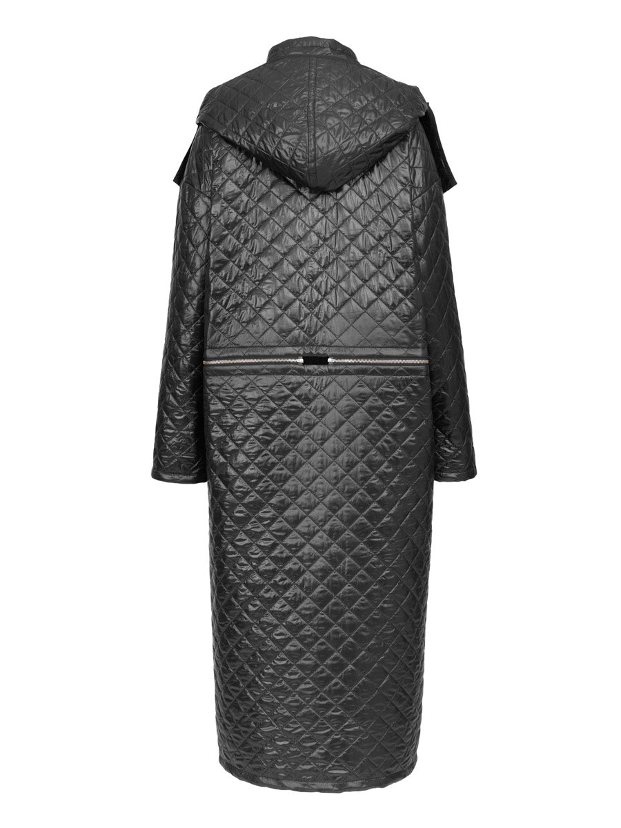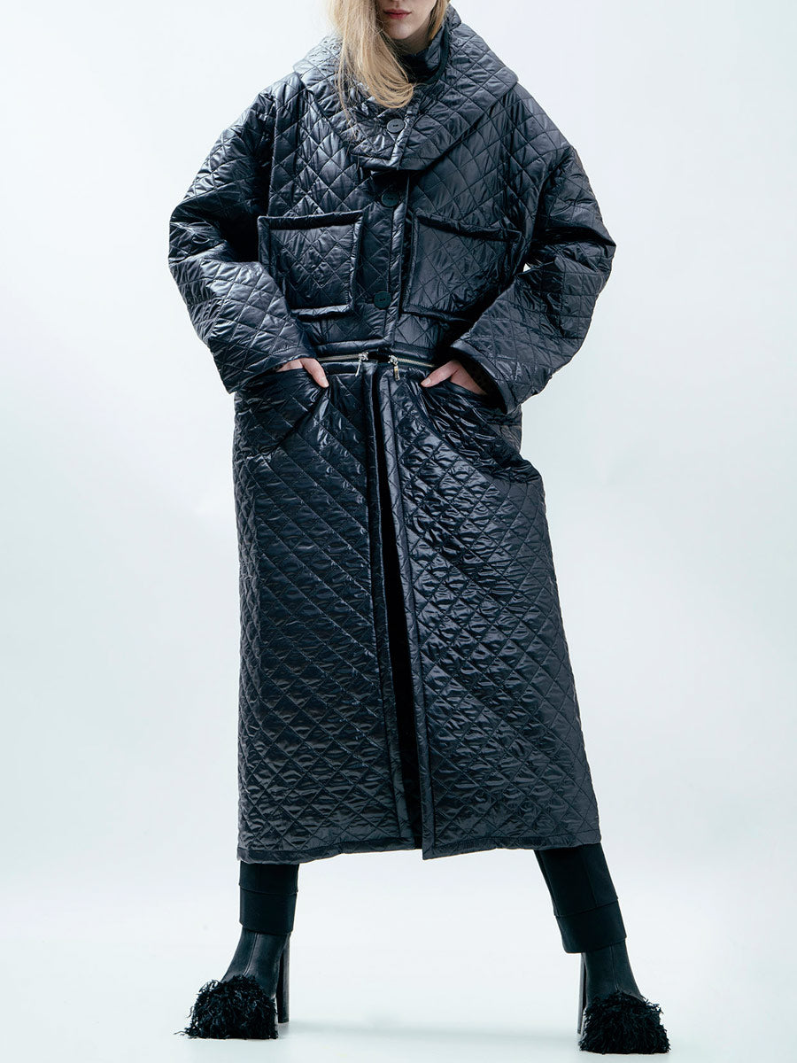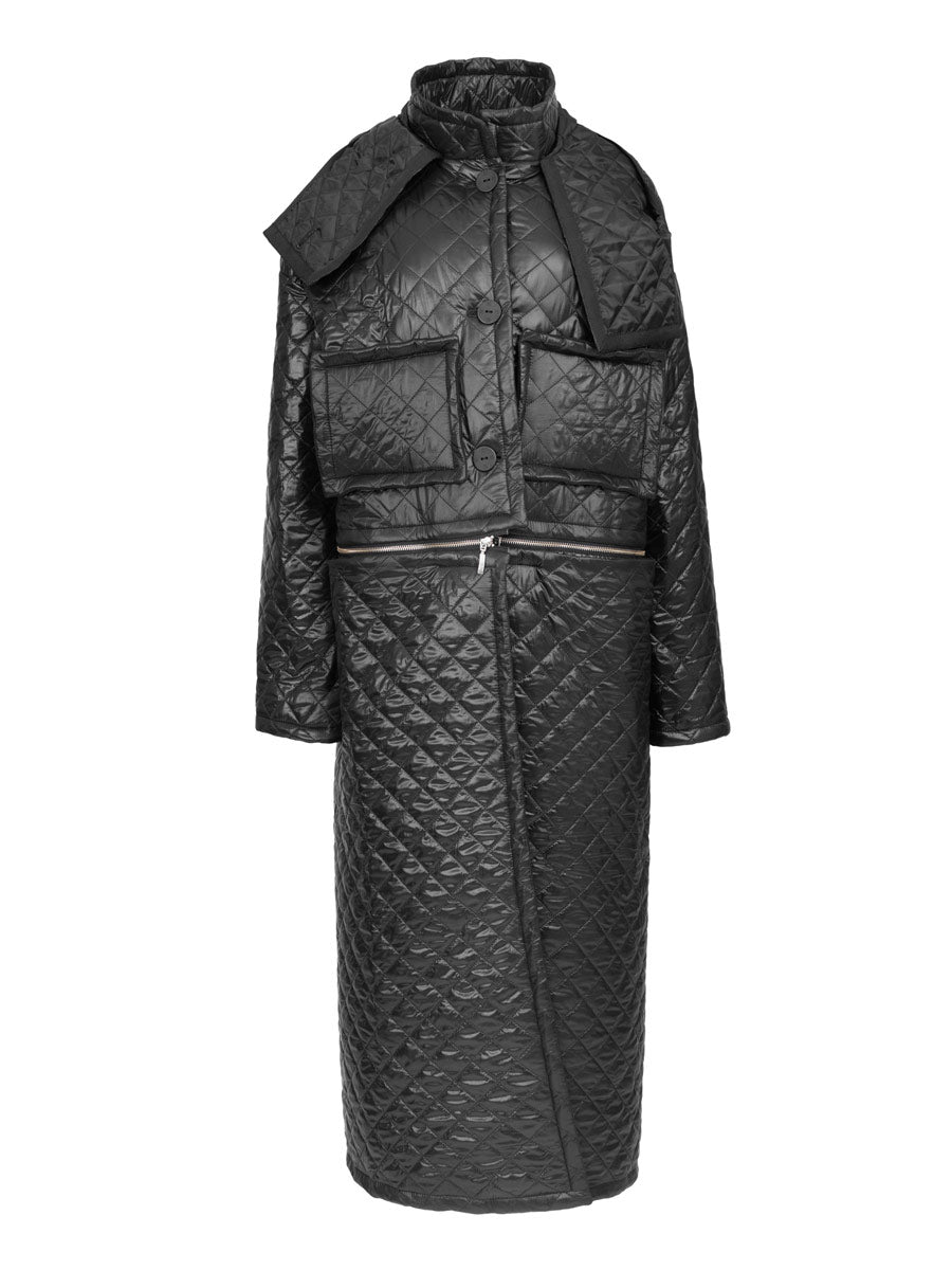 Xenia Design "Hera" Coat features their intricate quilted design in this gorgeous multi look coat/jacket. The multi-faceted design starts zip across the middle of the jacket, wear it like a long jacket with an asymmetric hem that allows them to overlap to keep you warm in style or unzip and turn it into a oversize avant-garde bomber. It also features 3 statement buttons down the middle adorned with two large pockets either side, and has a large collar that when buttoned up turns into a unique high collared hood, it is also completed with wide long sleeves which perfectly finish off this wide cut look.