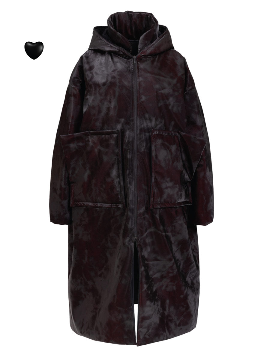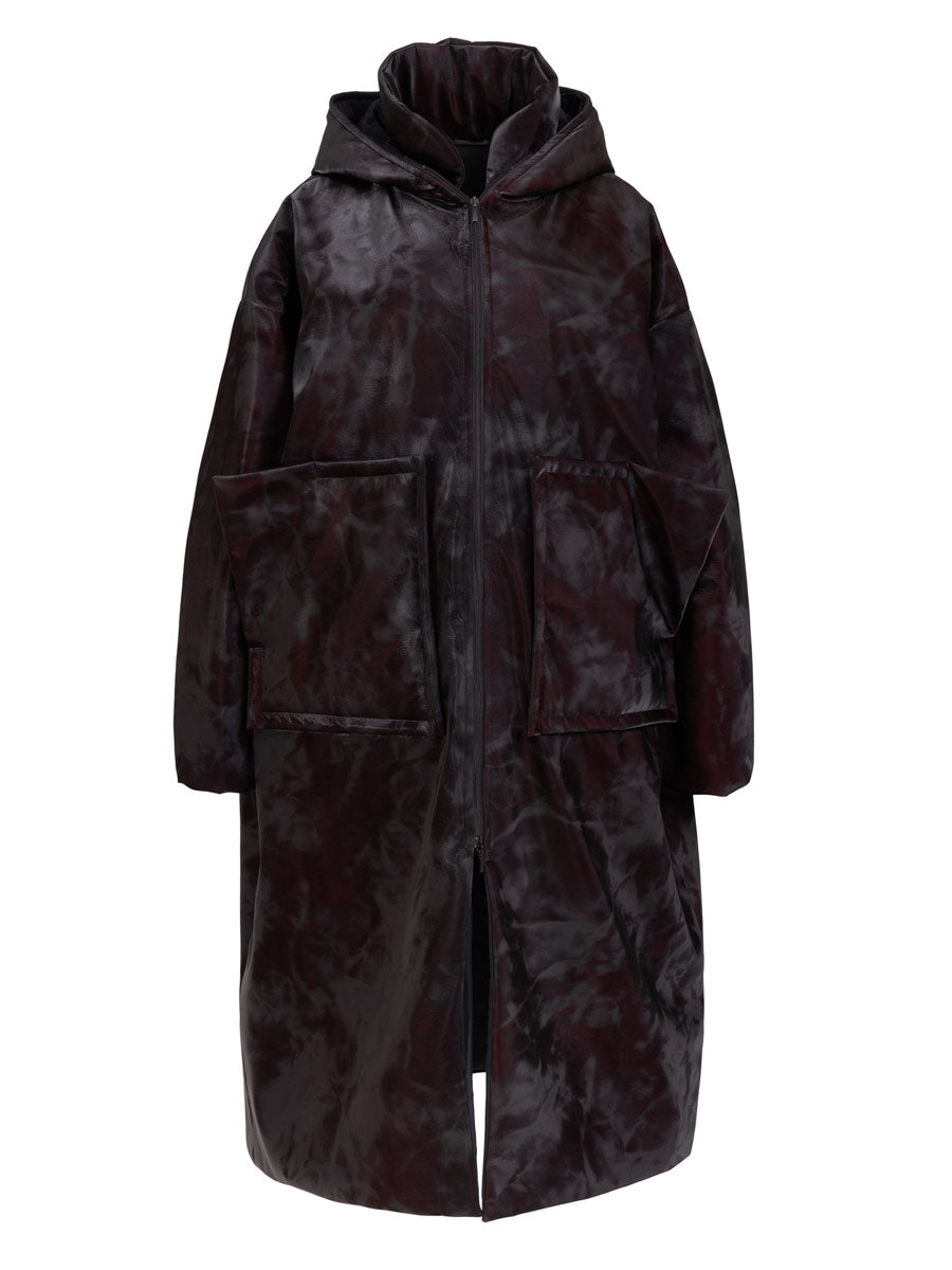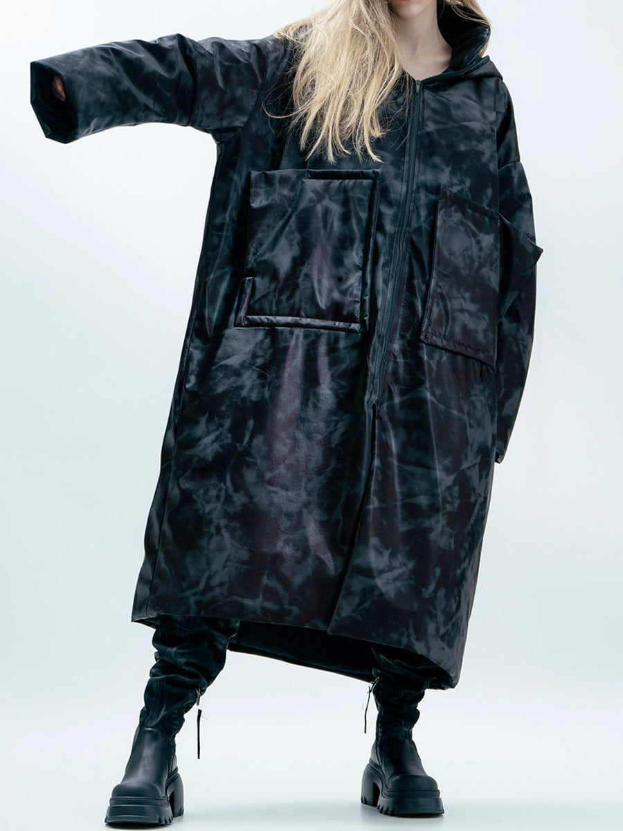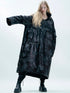 Indulge in luxury with the Xenia "Lubi" Coat. This premium winter coat features a wide cut, oversized fit with a maxi length and subtle padding. A hood and two spacious front pockets with side entry add functional and fashionable elements to this piece. The long maxi sleeves and unique semi sheen oily water print/fabric add an elegant touch.