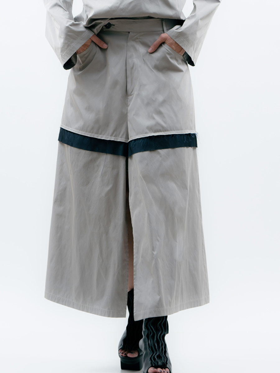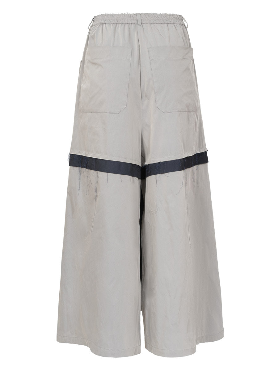 • This super taffeta mix skirt of grey beige and dark blue is just a little special. Could it be the culotte styling? Or the dramatic contrast panel of dark blue across the skirt?